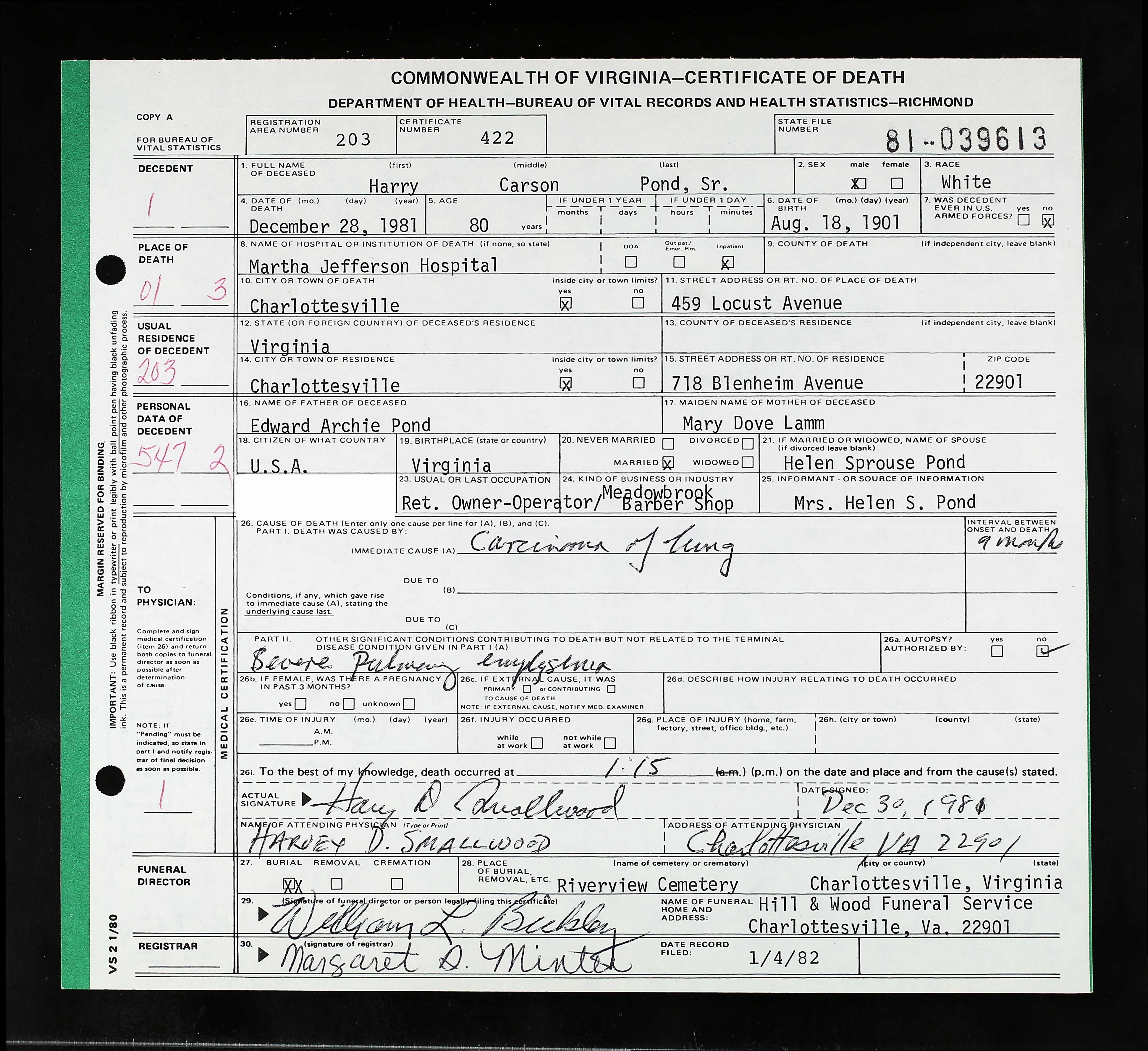 456. Augusta County Clerk of Court, Harry Carson Pond & Patsy Ann Harlowe.