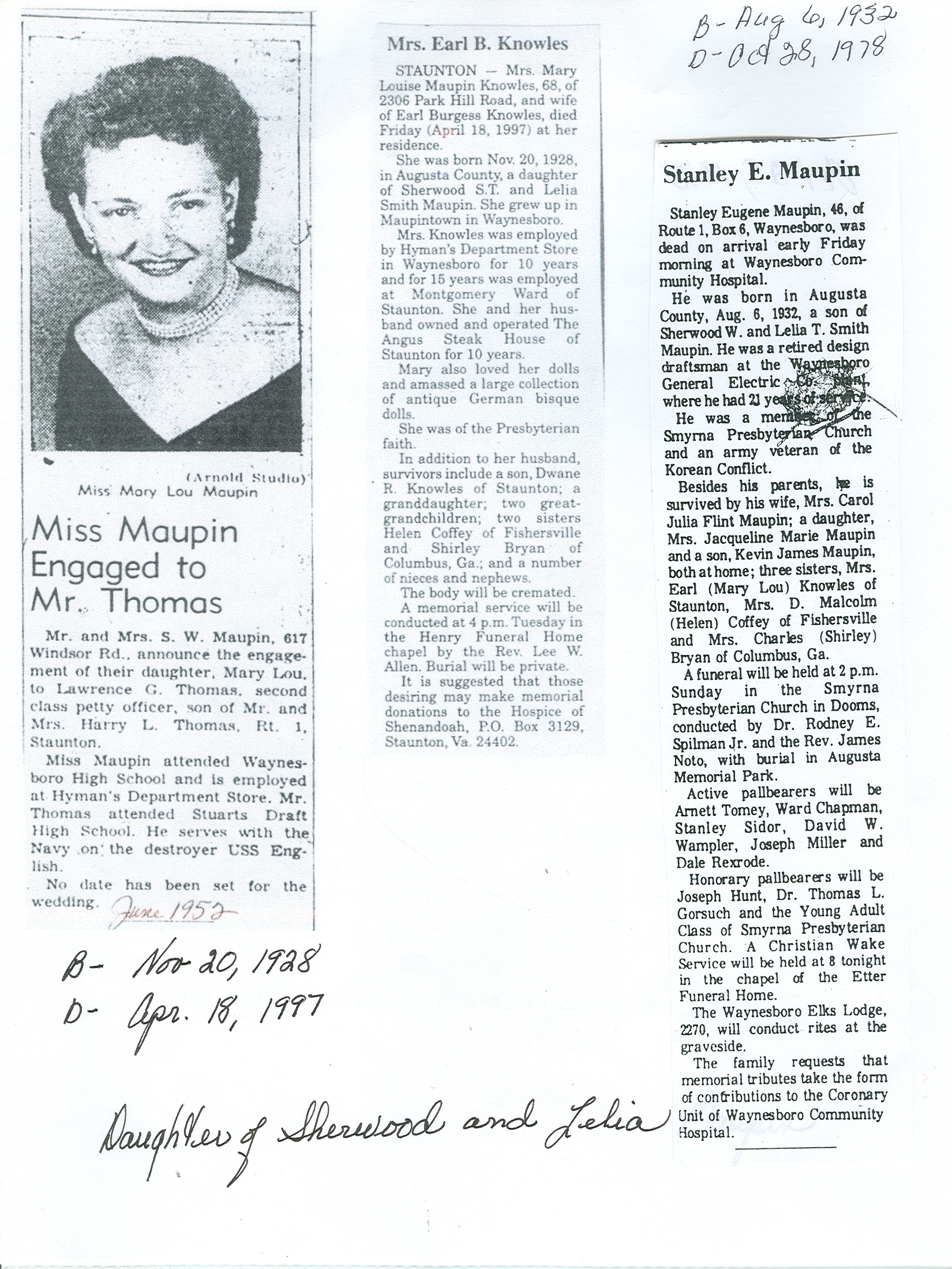 437. Obituary from Waynesboro, VA Newspaper, Mary Louise Maupin Knowles.