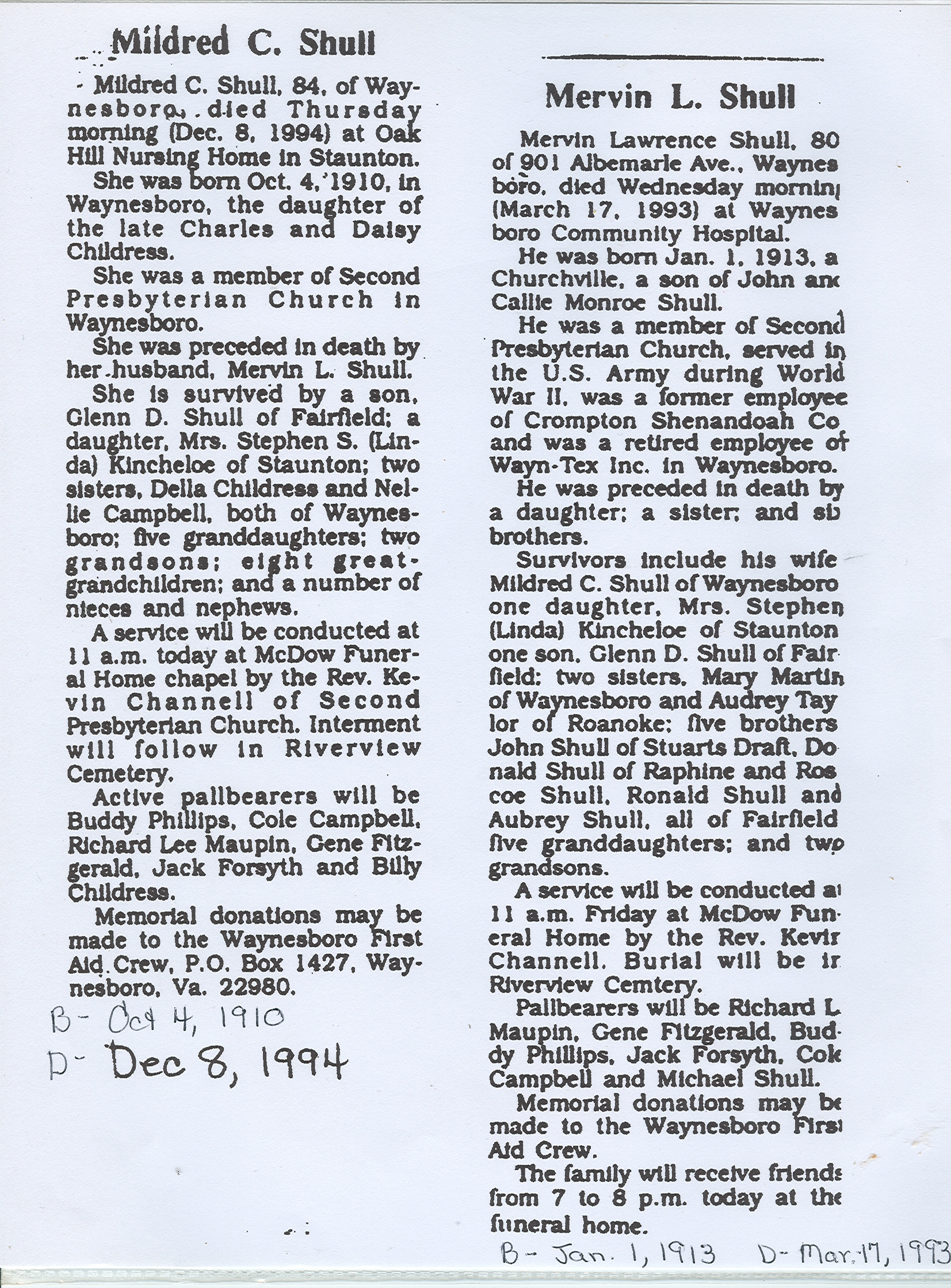 448. Obituary from Waynesboro, VA Newspaper, Mervin Lawrence Shull.