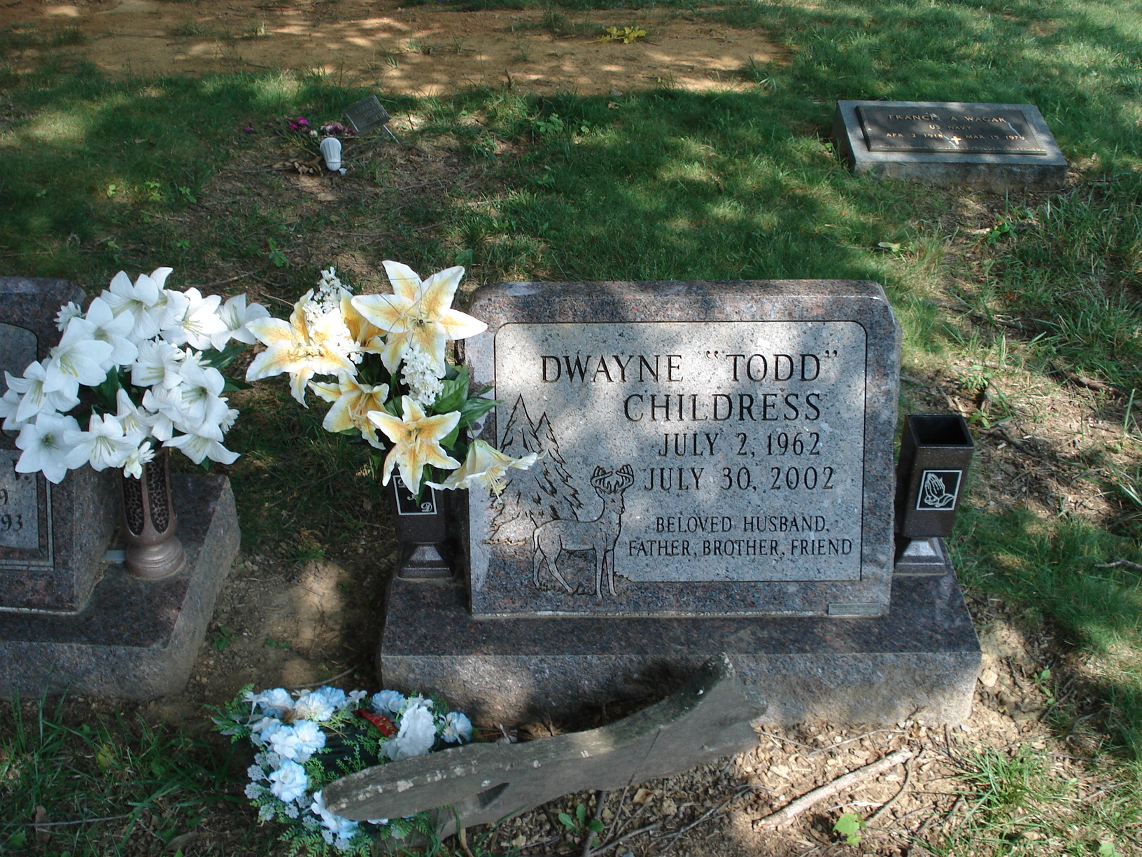 400. Dwayne Todd Childress was born on 2 Jul 1962 in Waynesboro, Augusta County, Virginia, USA, died on 30 Jul 2002 in Fisherville, Augusta County, Virginia, USA,478 at age 40, and was buried on 2 Aug 2002 in Riverview Cemetery, Waynesboro, Augusta County, Virginia, USA.