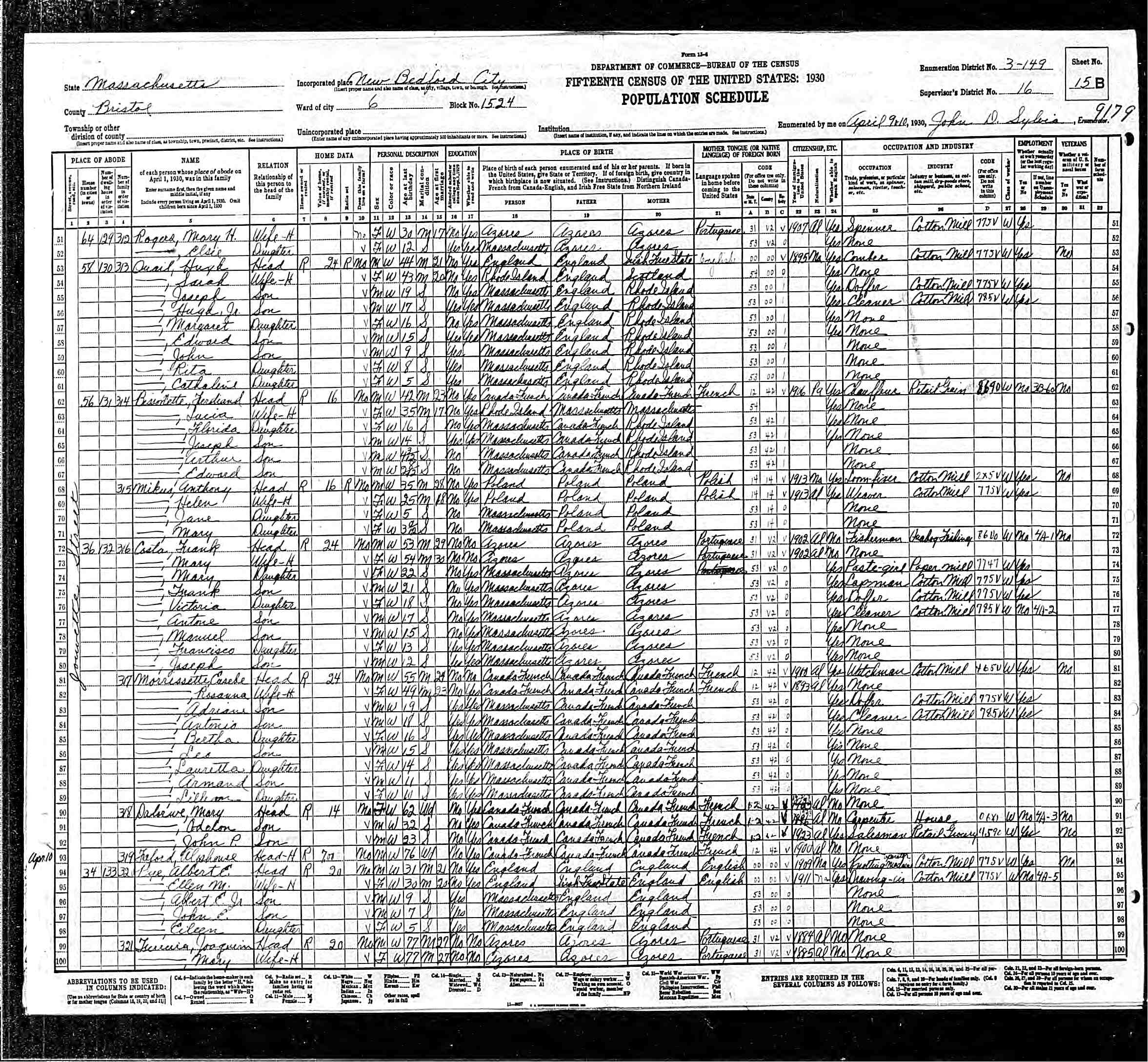 233. 1930 Massachusetts Census, Bristol, New Bedford, ED 149, Sht 15B.