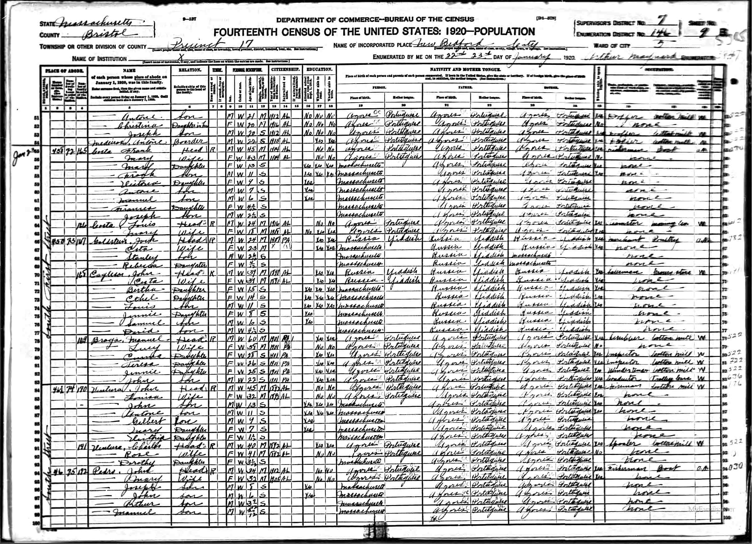 232. 1920 Massachusetts Census, Bristol, New Bedford, ED 146, Sht 9A.