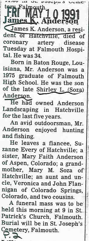 239. Massachusetts Death Index, 1970-2003, James K. Anderson Certificate: 029170 POD: Falmouth DOD: 7 May 1991 POB: Louisiana DOB: 19 Jun 1956.