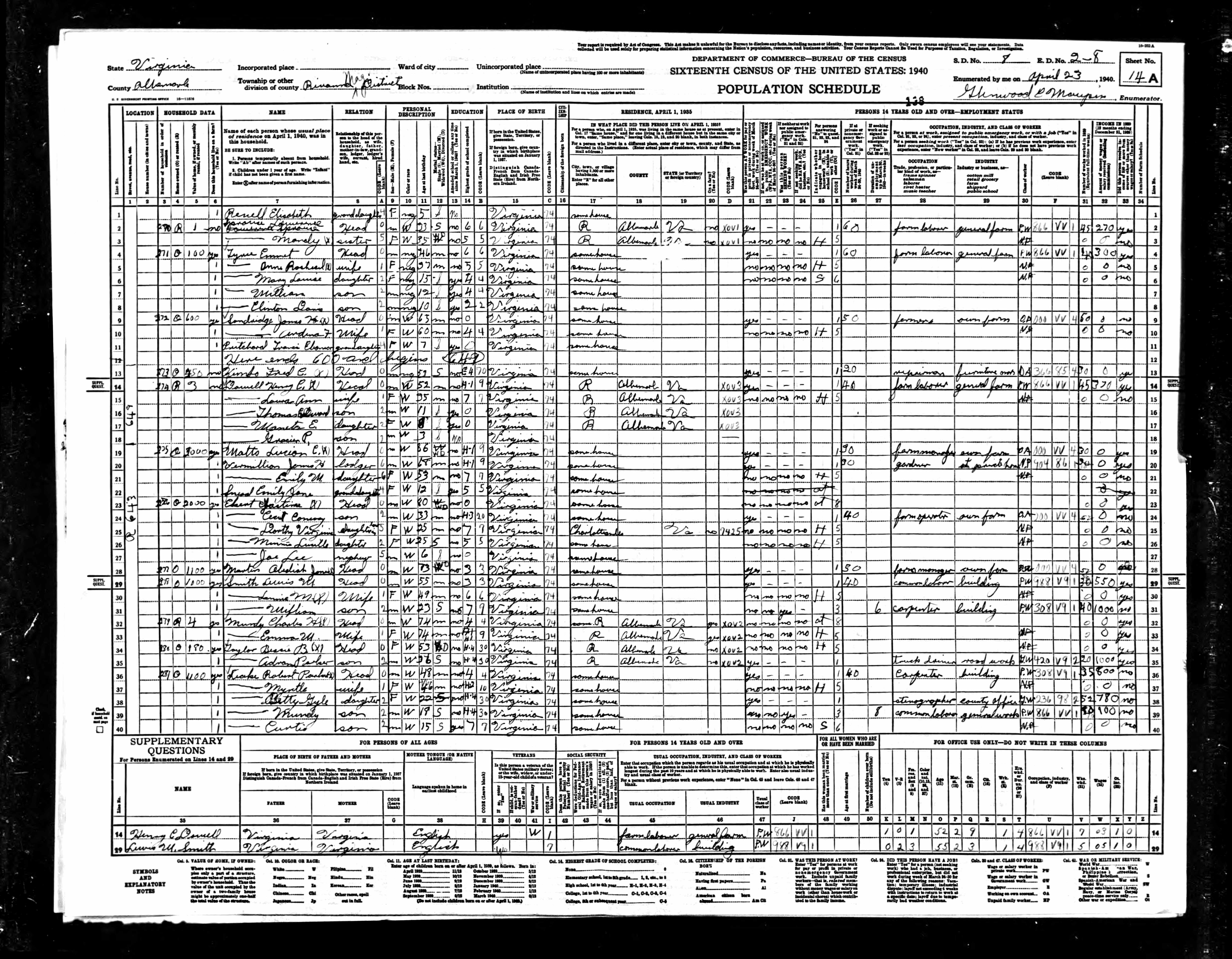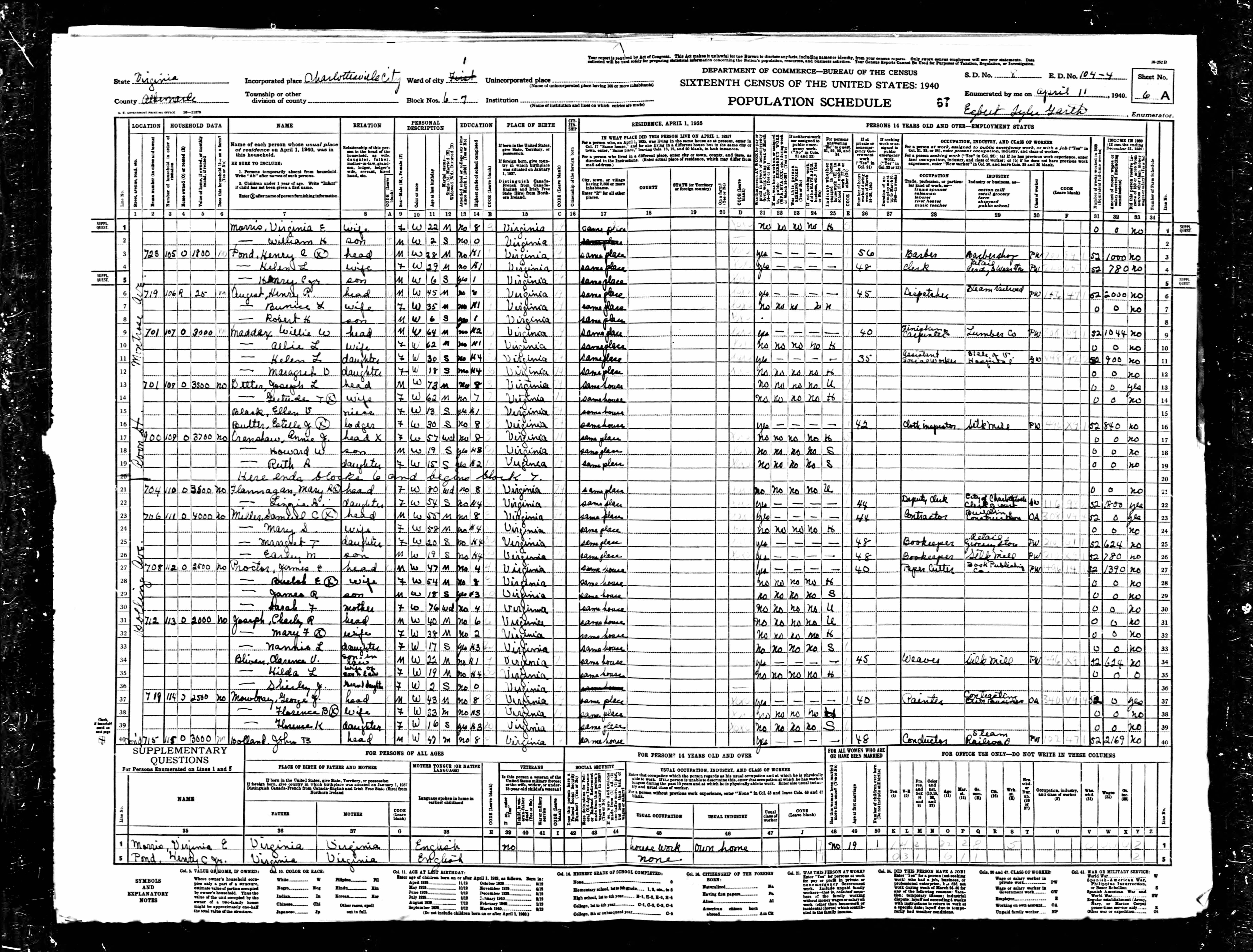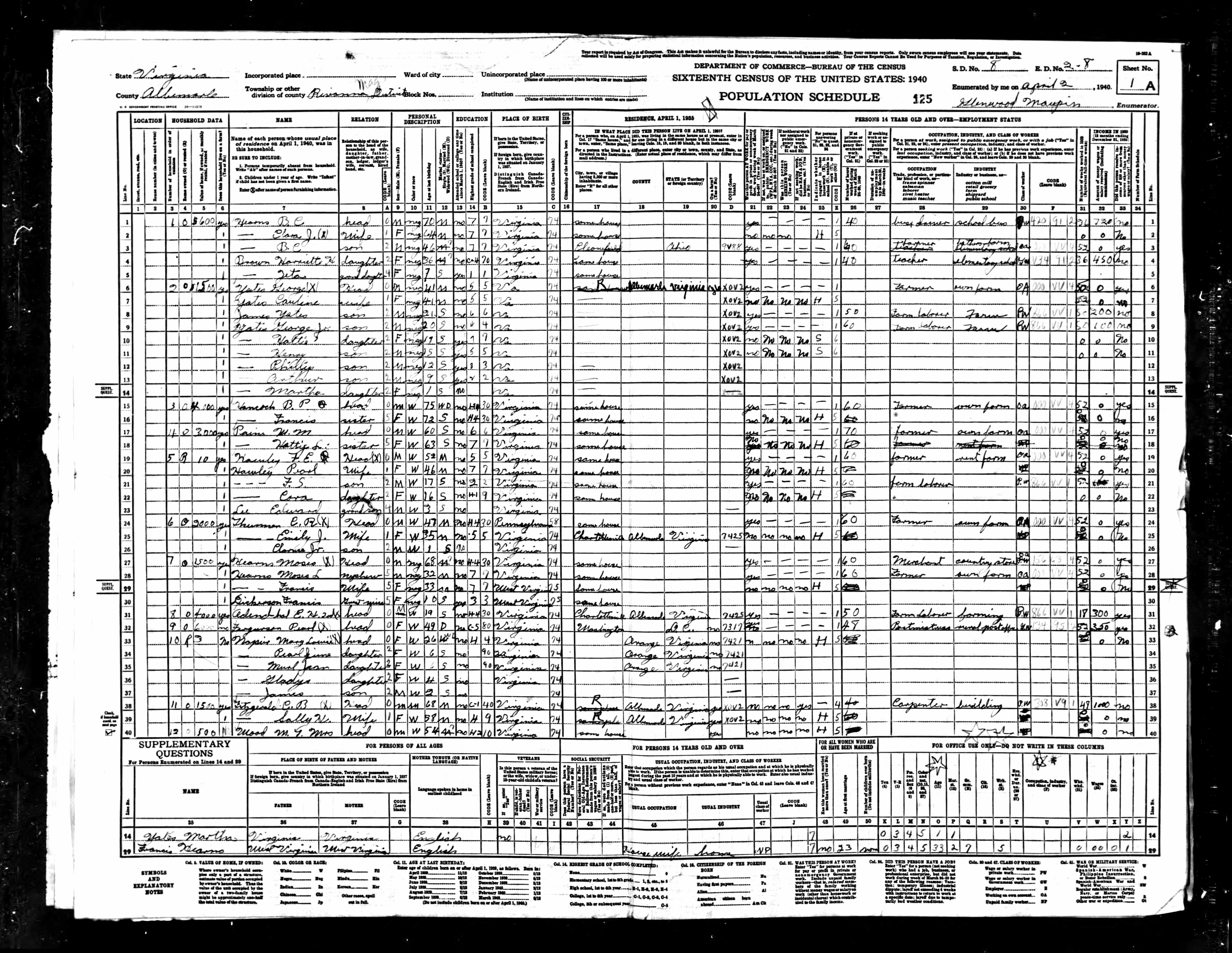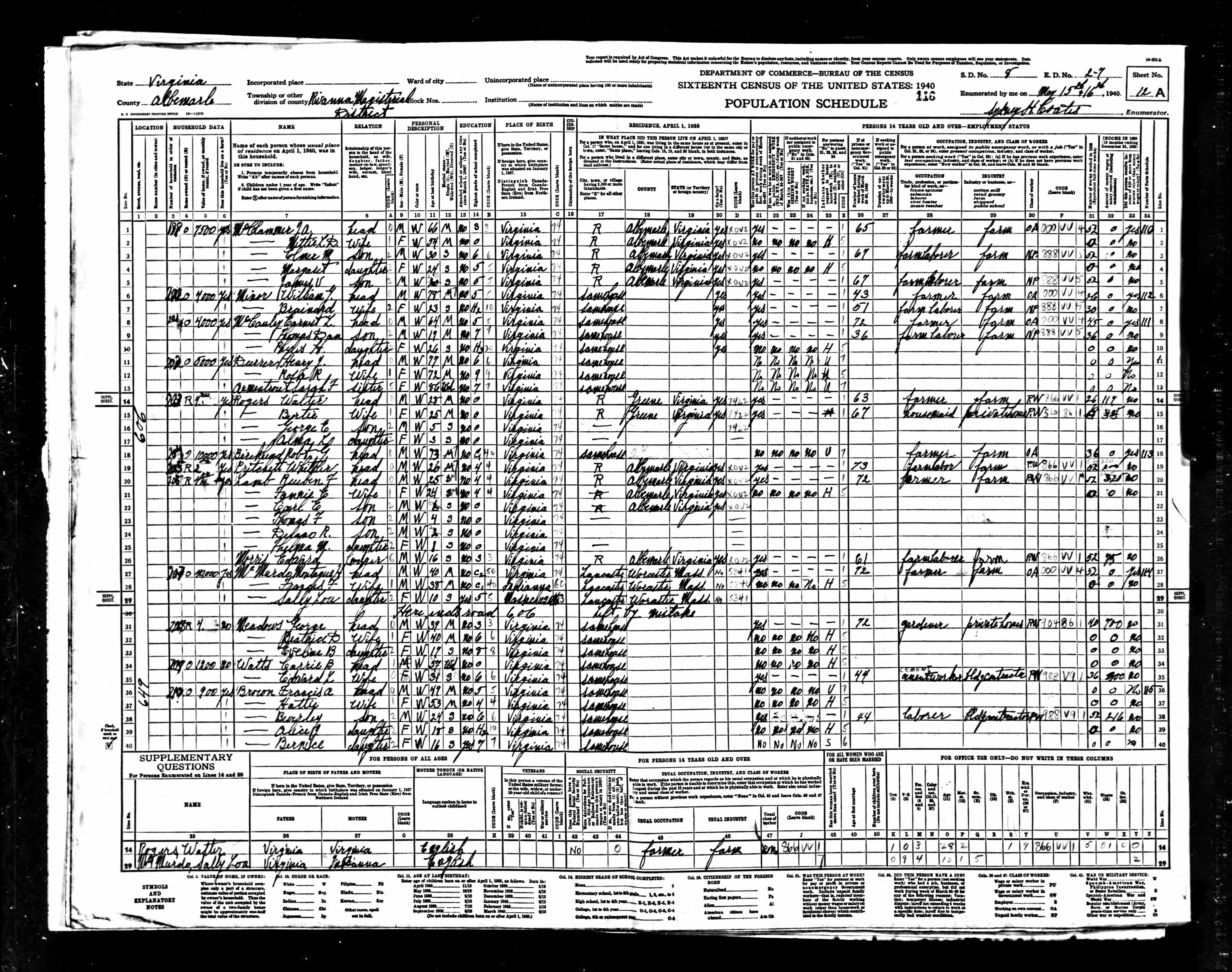 1074. 1940 Virginia Census, Albemarle, Rivanna, ED 2-6, Sht 11B, Image 22 Roll T627.