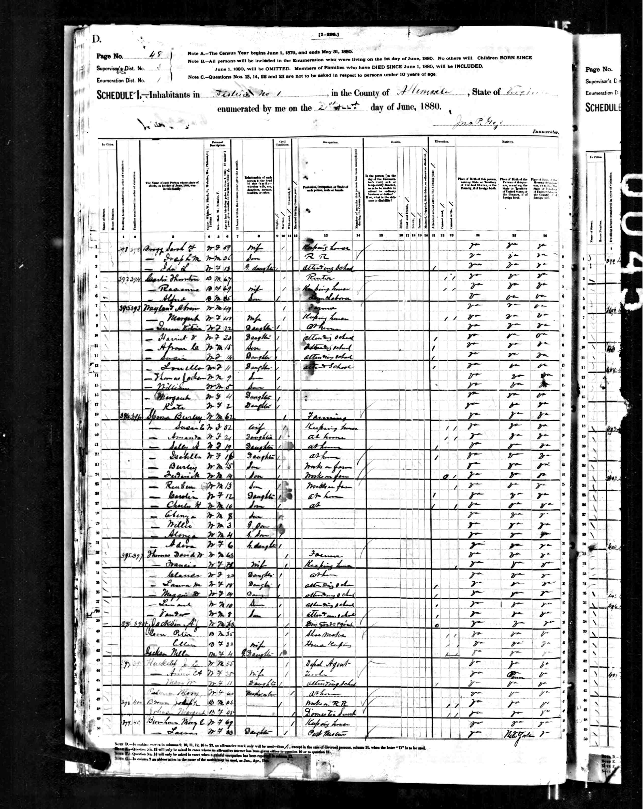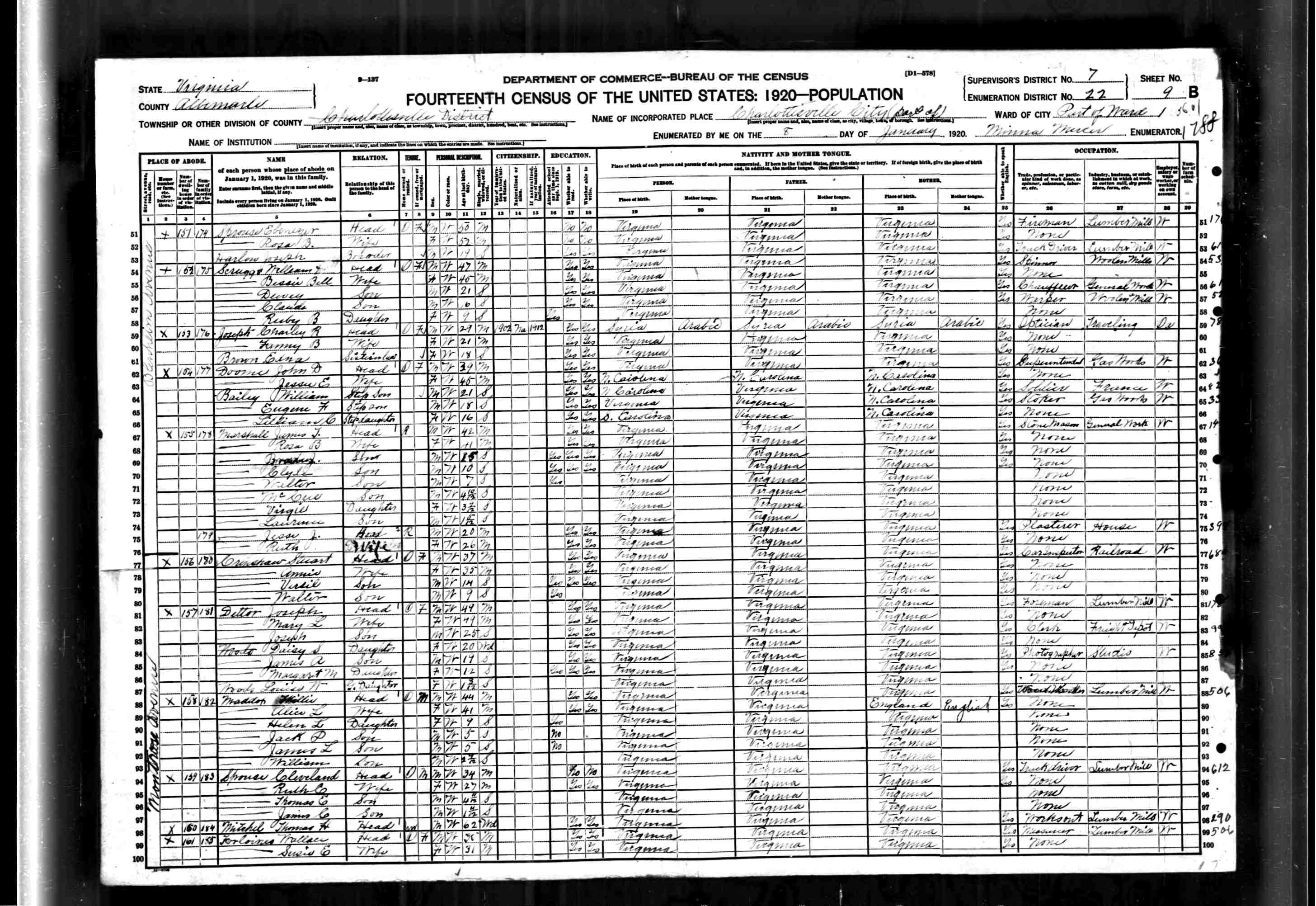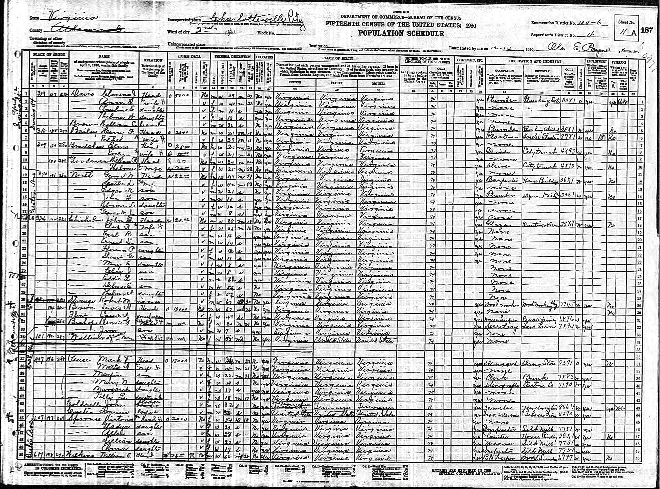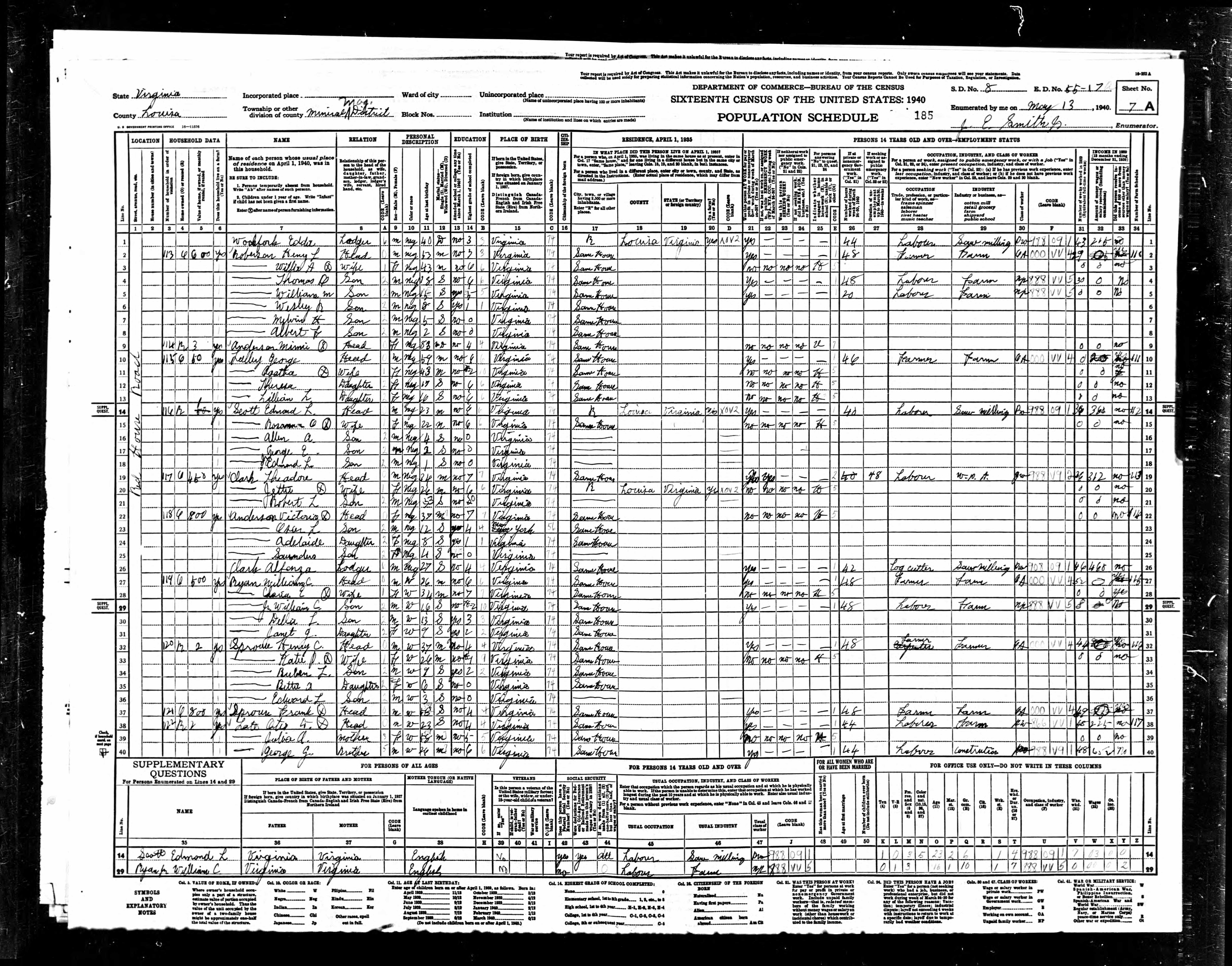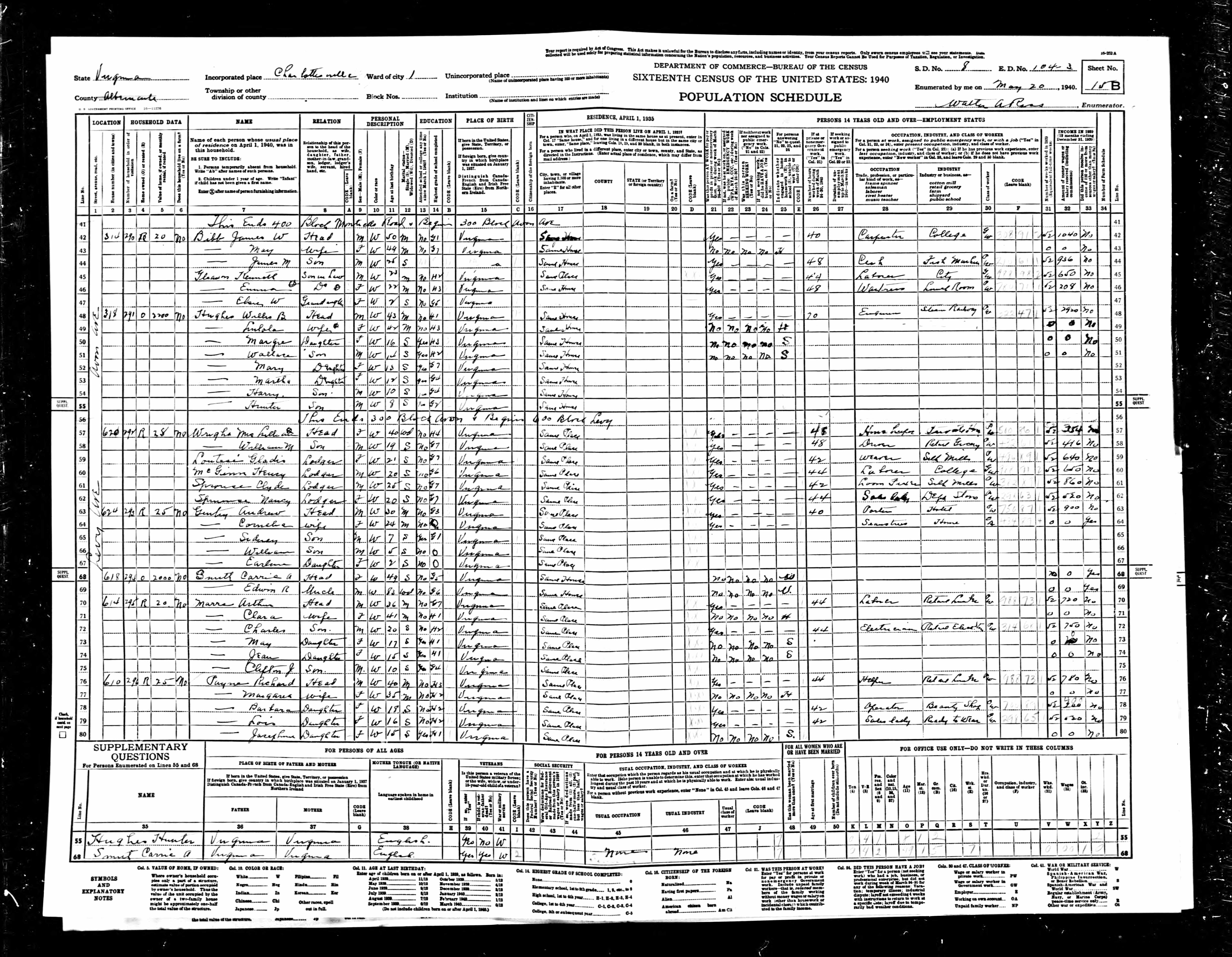 1074. 1940 Virginia Census, Albemarle, Rivanna, ED 2-6, Sht 11B, Image 22 Roll T627.