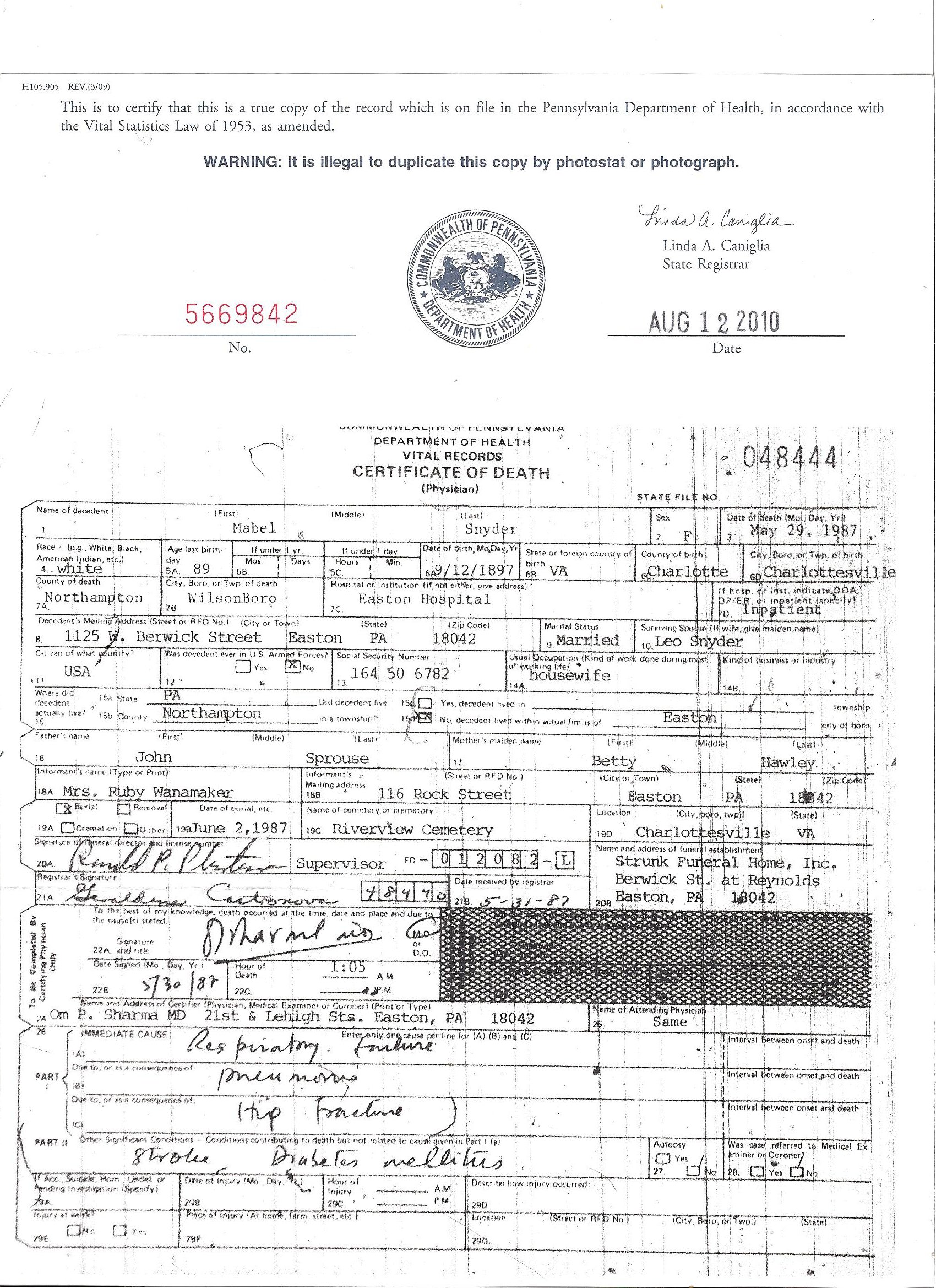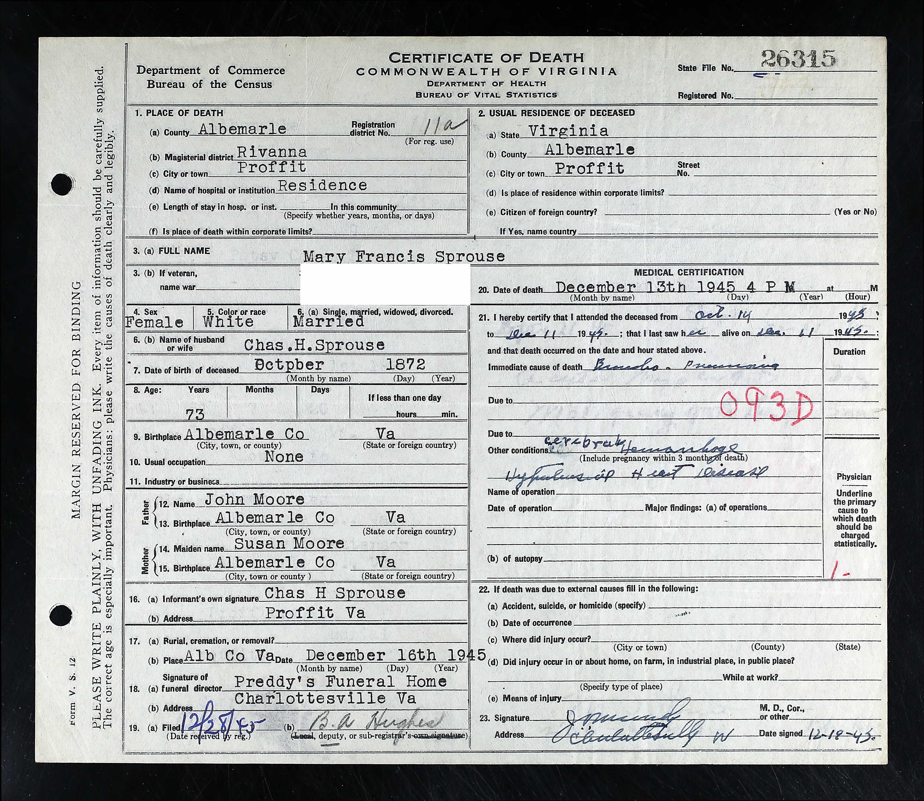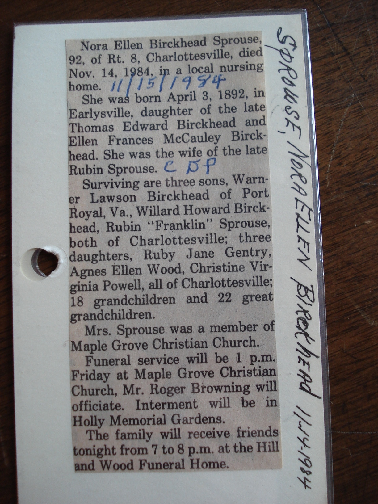 Deceased Name: Sprouse, Mrs. Maria M. Weidenbacher