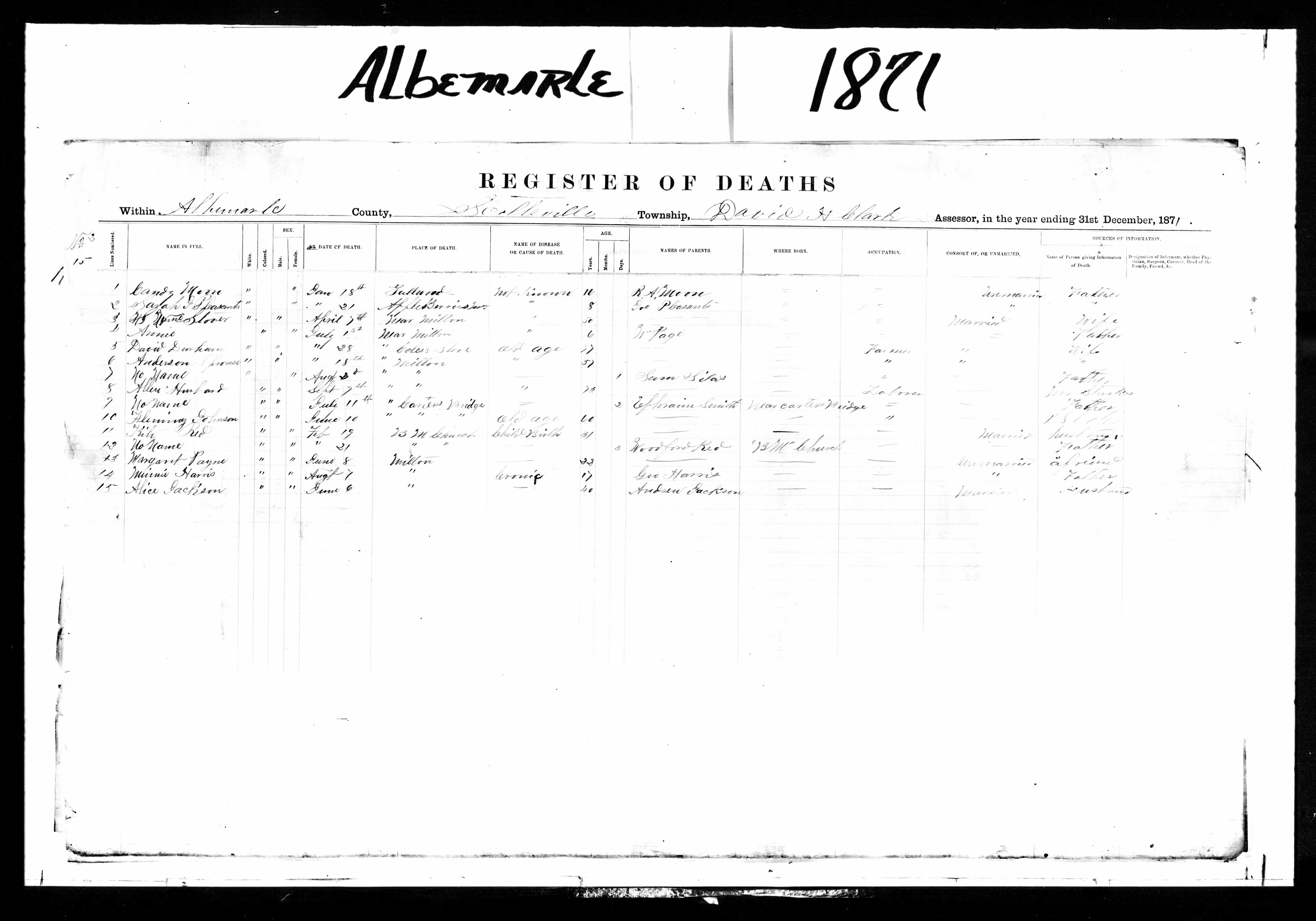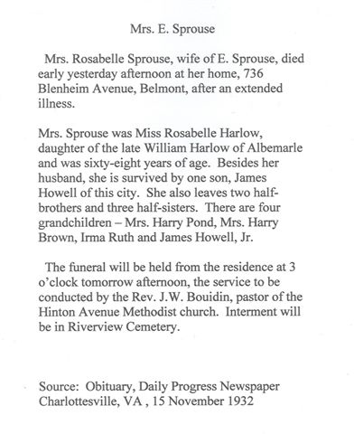 13. Albemarle County, Virginia Death Register, John Sprouse. Microfilm "Virginia State Archives" Death Records of Albemarle County 1857, Line 115.