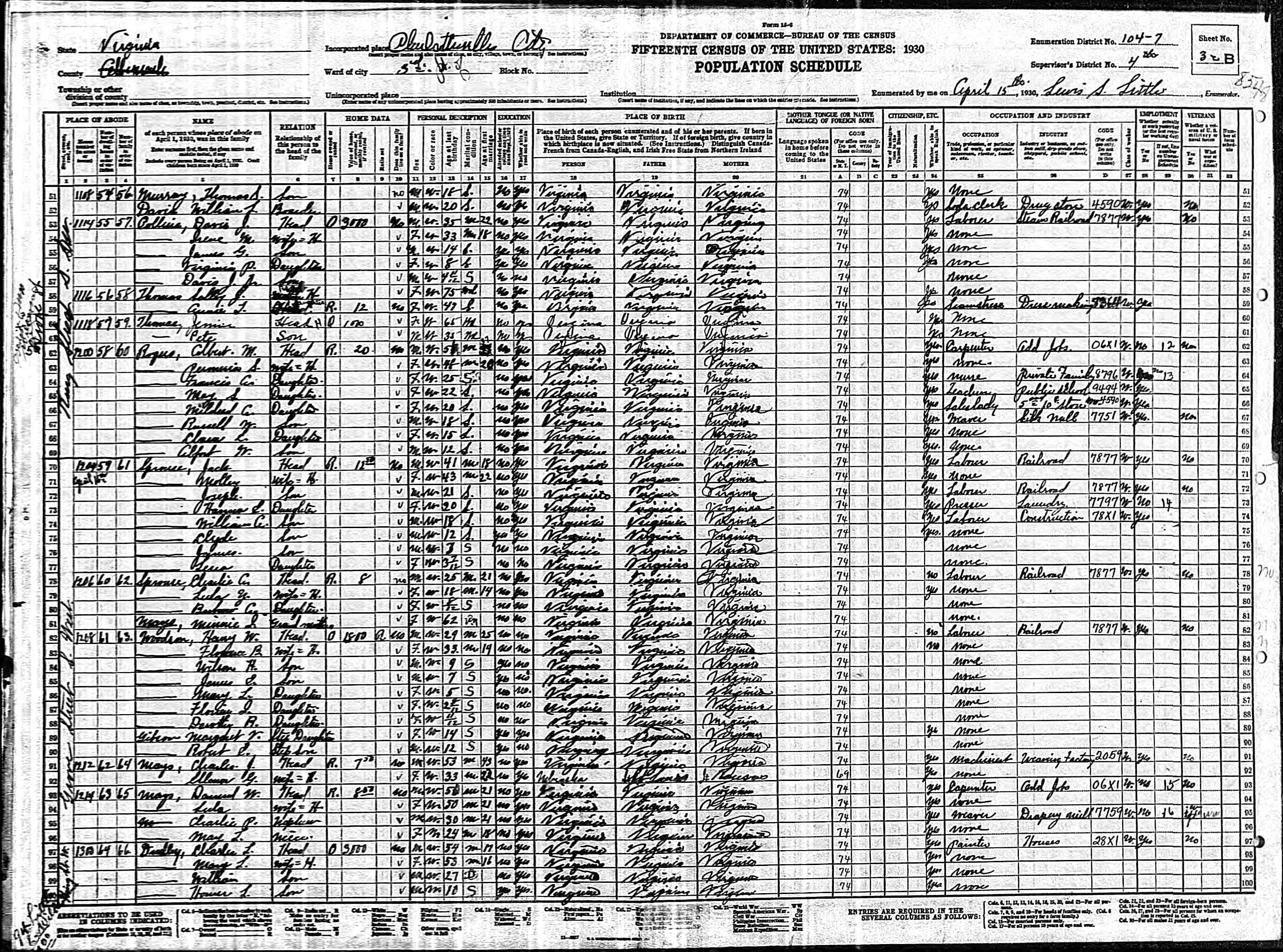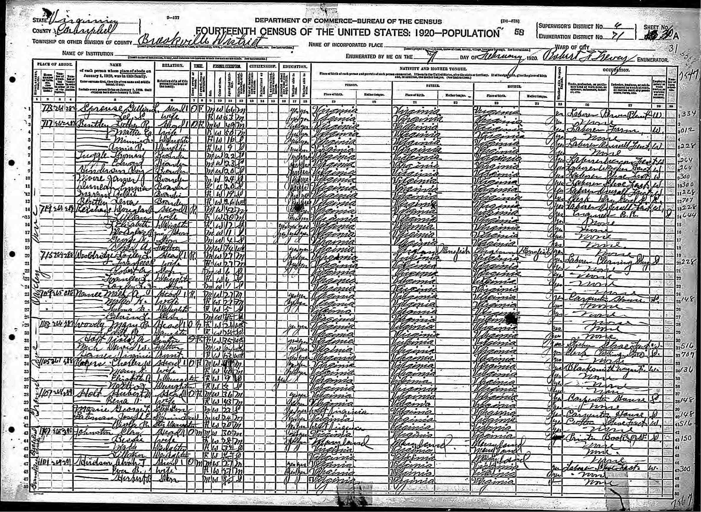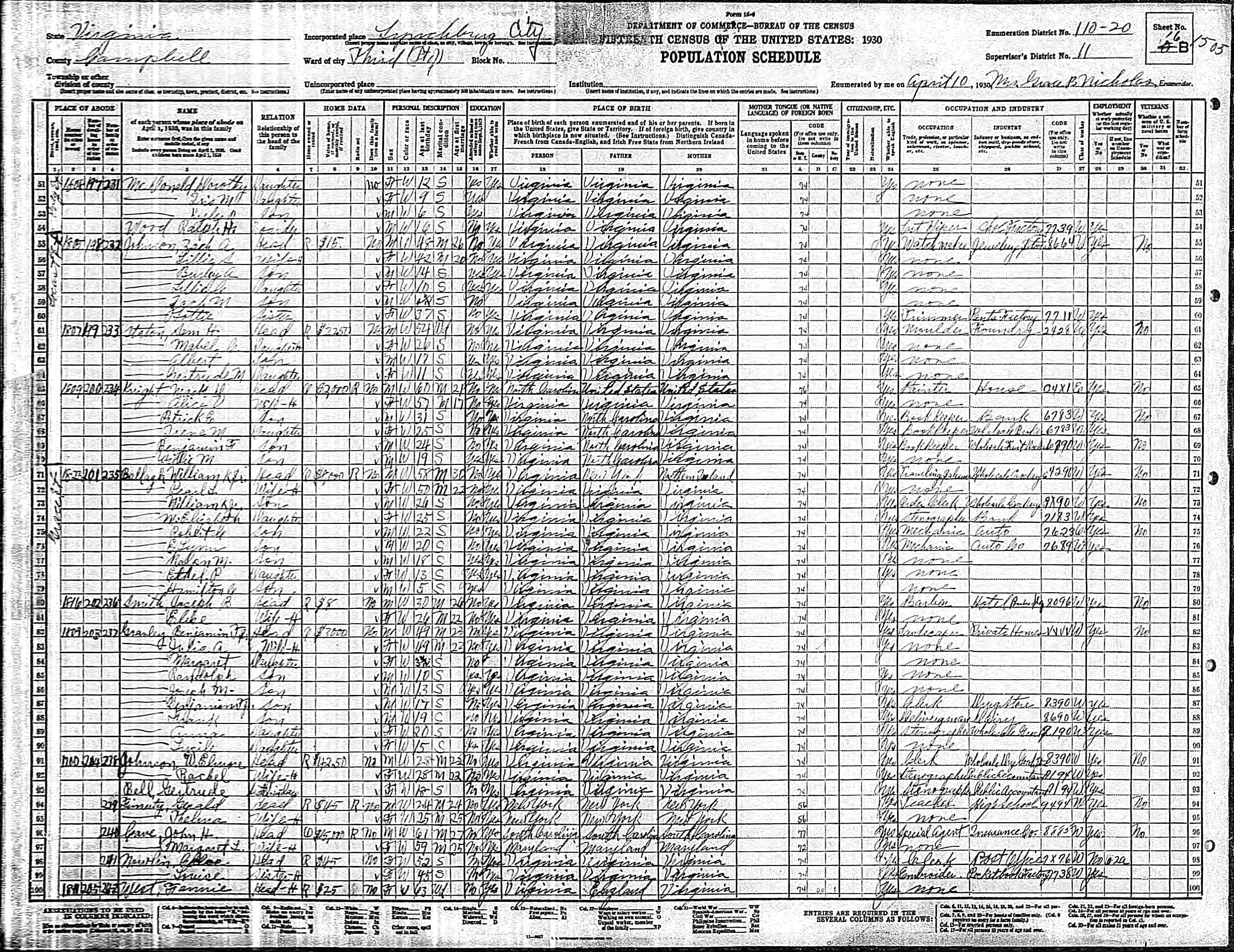 1063. 1930 Virginia Census, Lynchburg, Lynchburg, ED 20, Sht 14B, Image 28 Roll 2468, p. 14B, ED 20, Image 967.