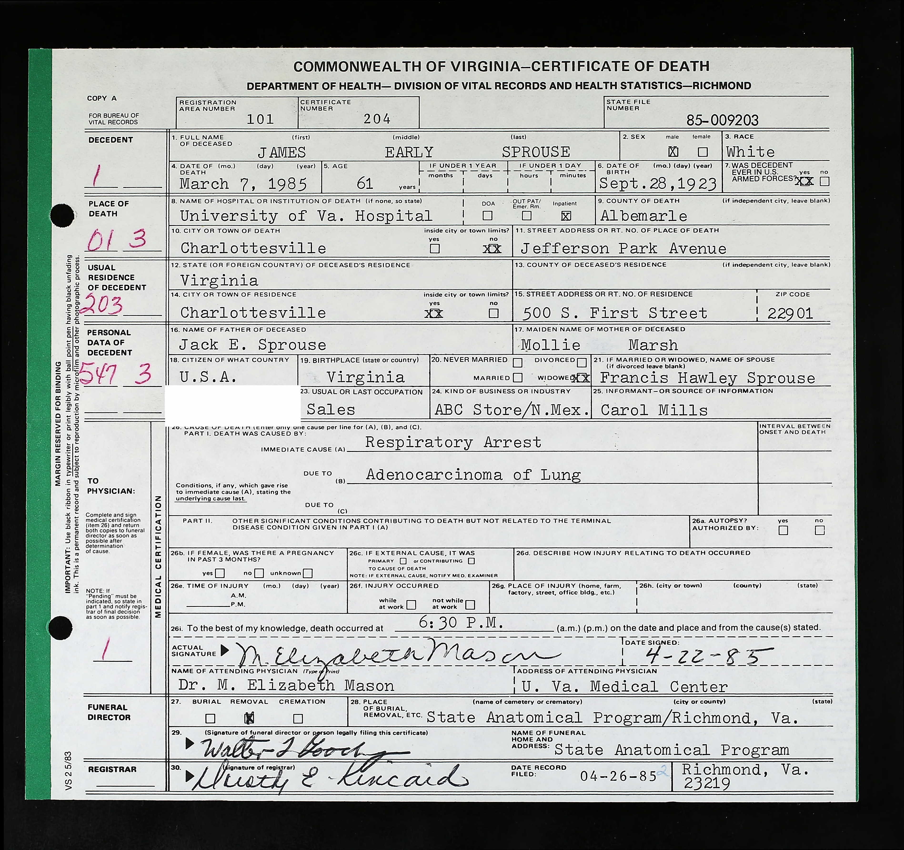 1077. Social Security Death Index, D. Cary Jackson. 223-34-9509.