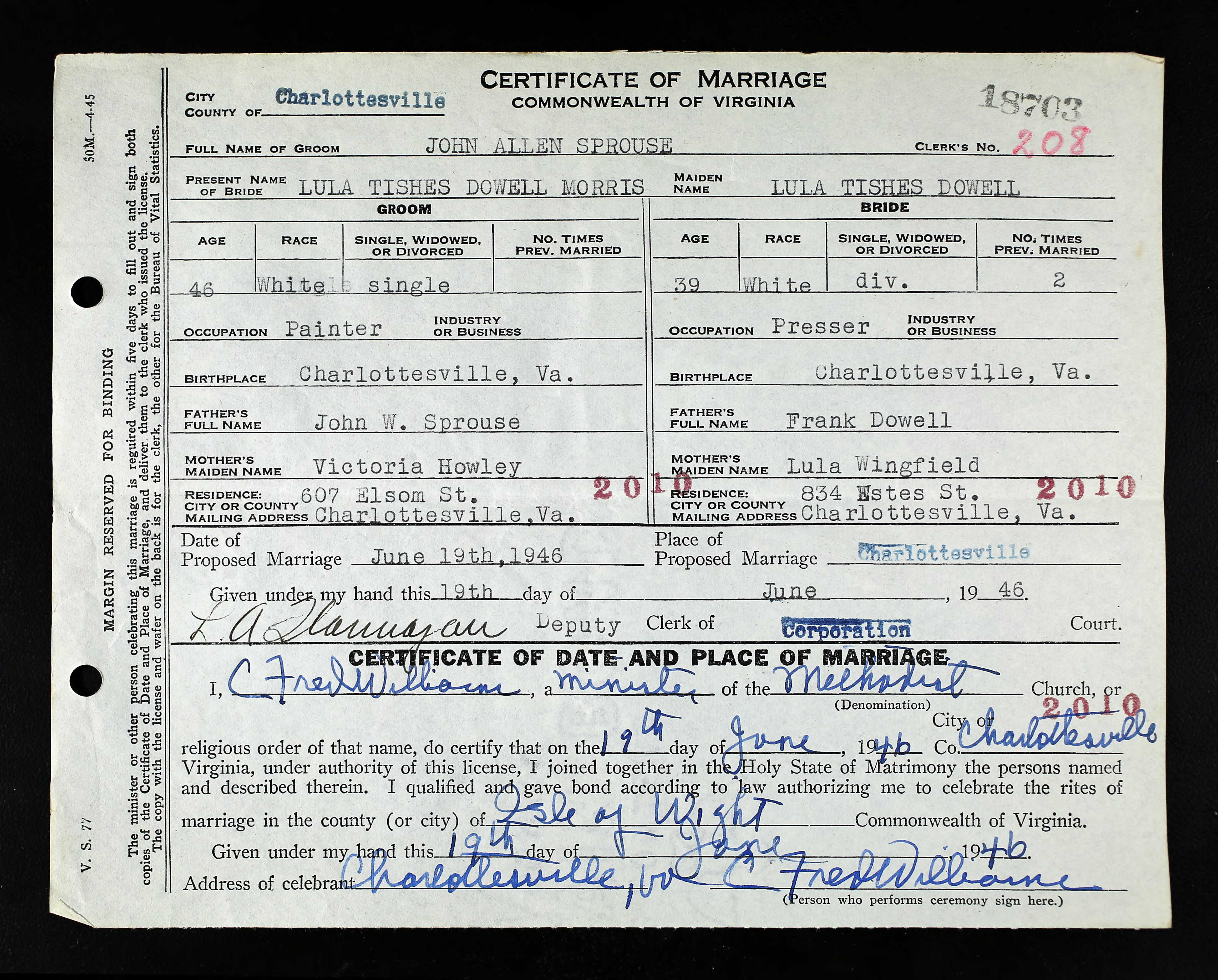 1087. Charlottesville, VA Marriage Records, Marriage Certificate.