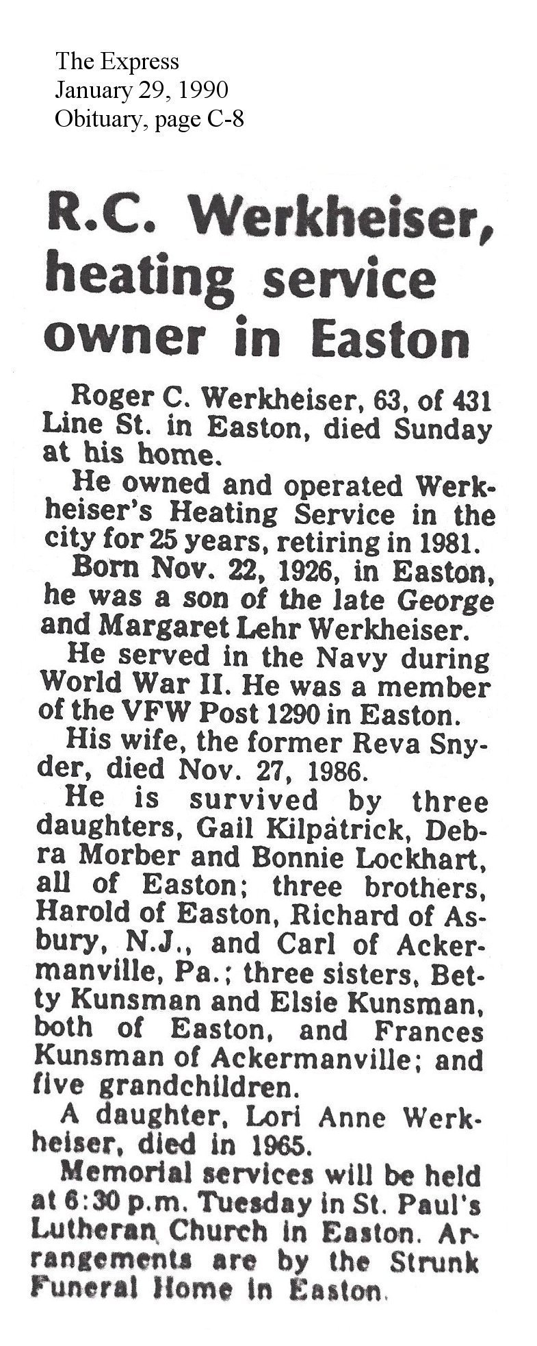 1070. Obituary, The Express - Obituary - R.C. Werkheiser, p. C8.