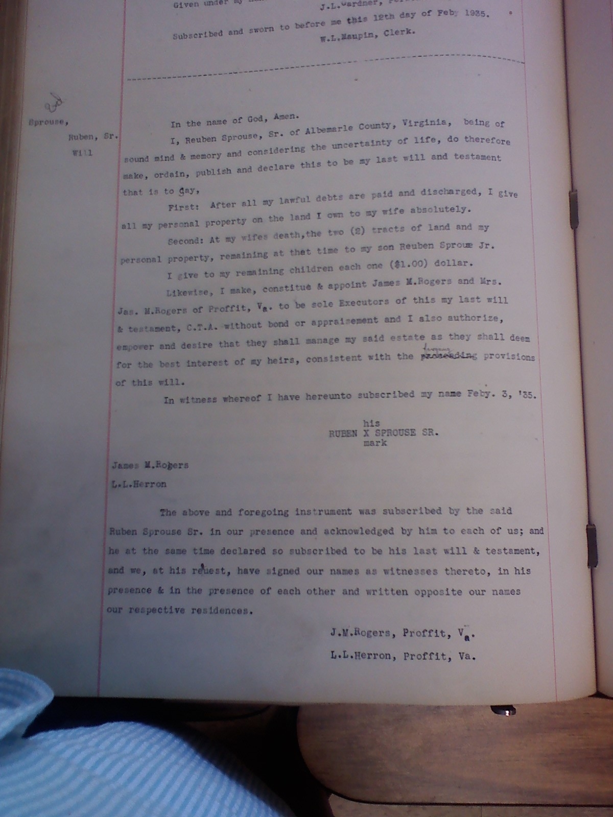 1. Abstracts of Louisa County, Virginia Will Book,1743-1801, p. 6. Charles Sprouse was a witness to the Will of James Flanagan of Fredericksville Parish.