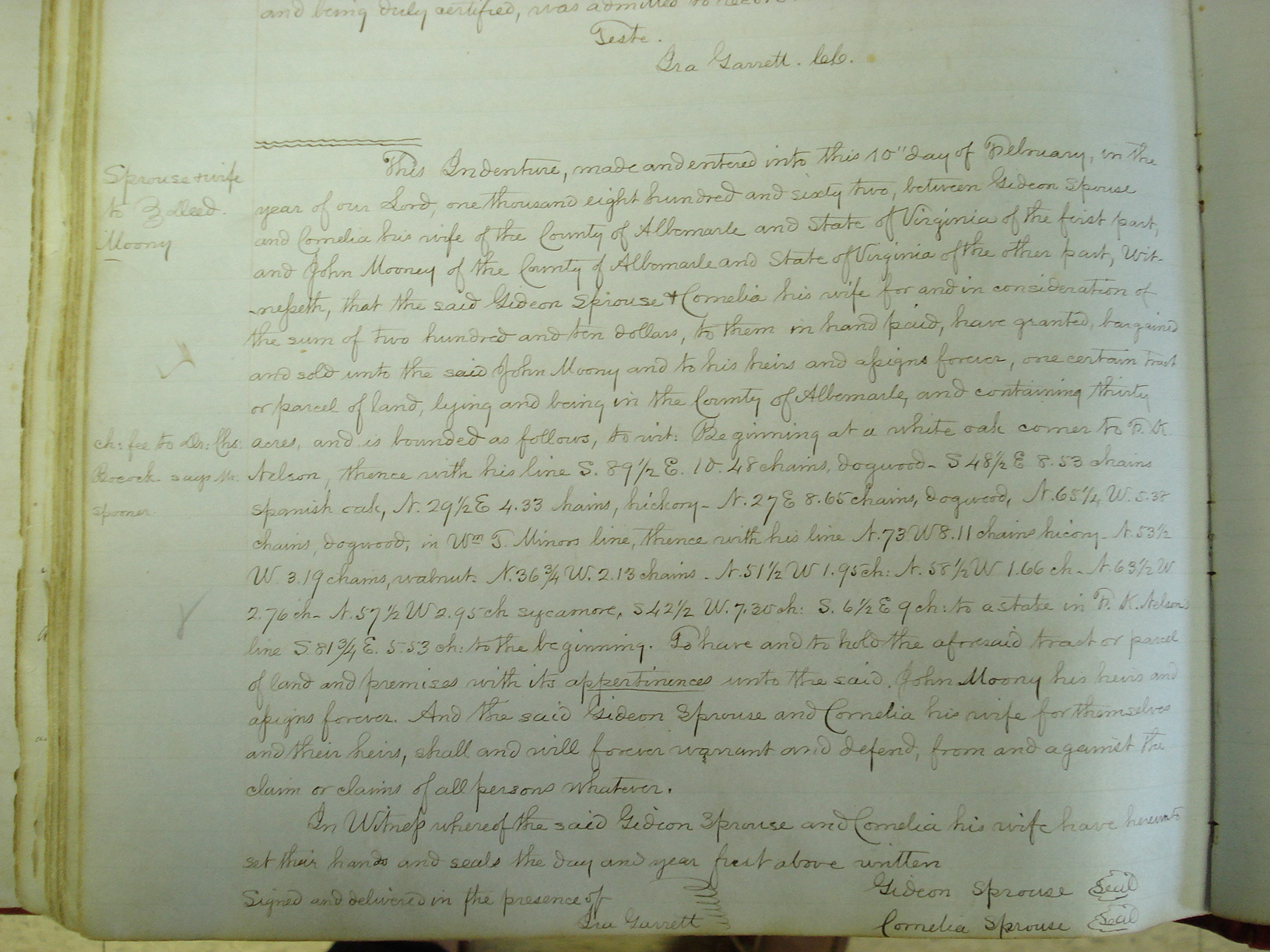 This indenture made this 28th day of September 1852 between John R. Jones appointed by the County Court of Albemarle to sell a track of land belonging to the Estate of Susan Thomas dec'd. of the one part and GIDEON SPROUSE of the other part. All of the County of the State of Virginia witnesseth that the said John R. Jones as _____ aforesaid for and in consideration of the sum of two hundred and fifty dollars to him in hand paid by the said Gideon Sprouse, the receipt whereof is hereby a knowledge have bargained sold to the said Gideon Sprouse his heirs and a certain tract of land lying and being in the county of Albemarle on the South West Mountain adjoining the land of John Rothwell, John Carr, Reuben Carver and others and supposed to be about one hundred acres, more or less. To have and to hold the said tract of land with all its appurtenances, thereunto belonging unto here the said Gideon Sprouse his heirs and assigns forever. And the said John R. Jones as commissioner an aforced will warrant and forever defend from the claim or claims of heirs the said Jones as commissioner afore and in witness whereof the said commissioner hath hereunto set his hand and seal the day and date above written.