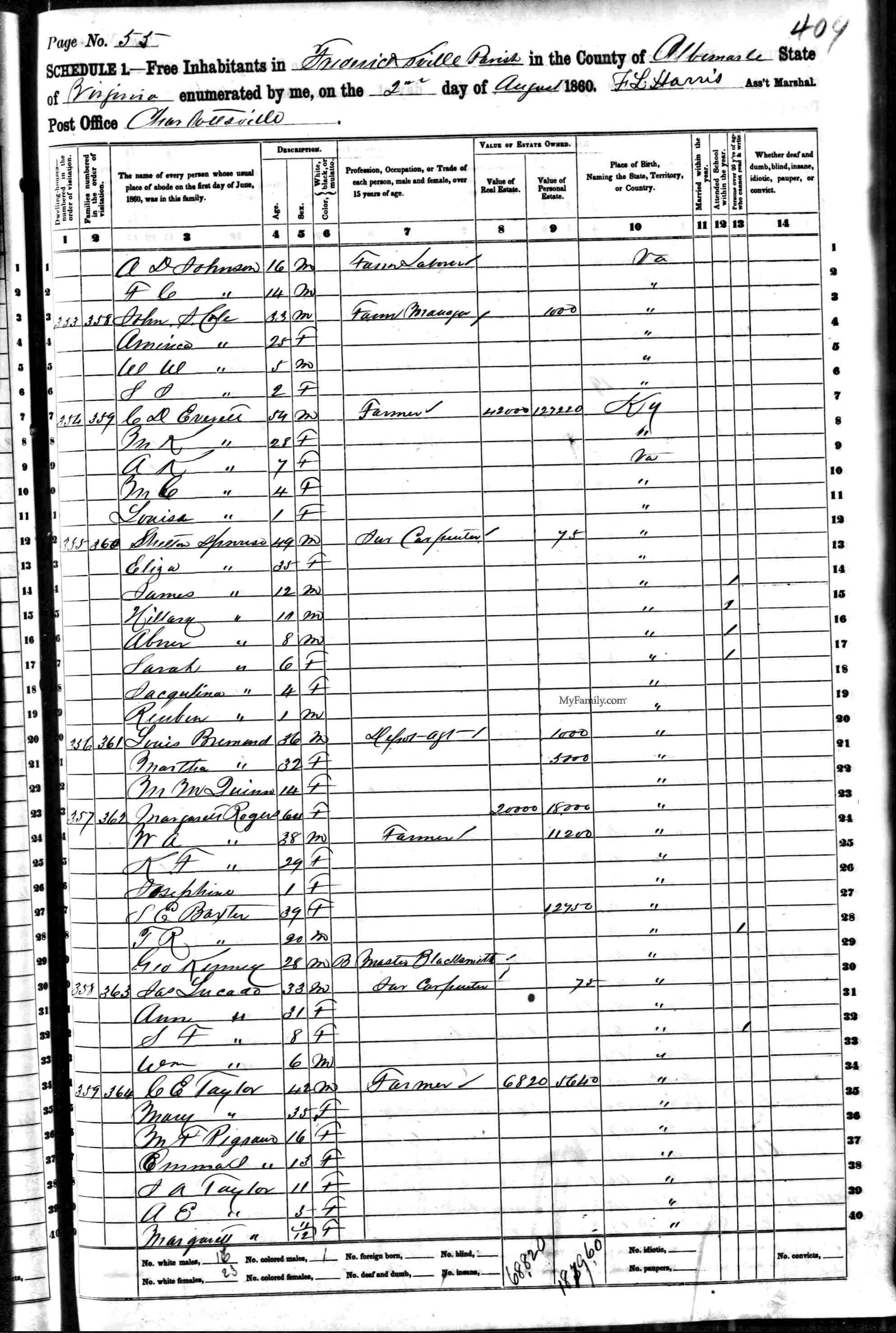 5. Census: John Carver and family, 2 Aug 1860, Fredericksville Parish, Albemarle County, Virginia, USA. 66