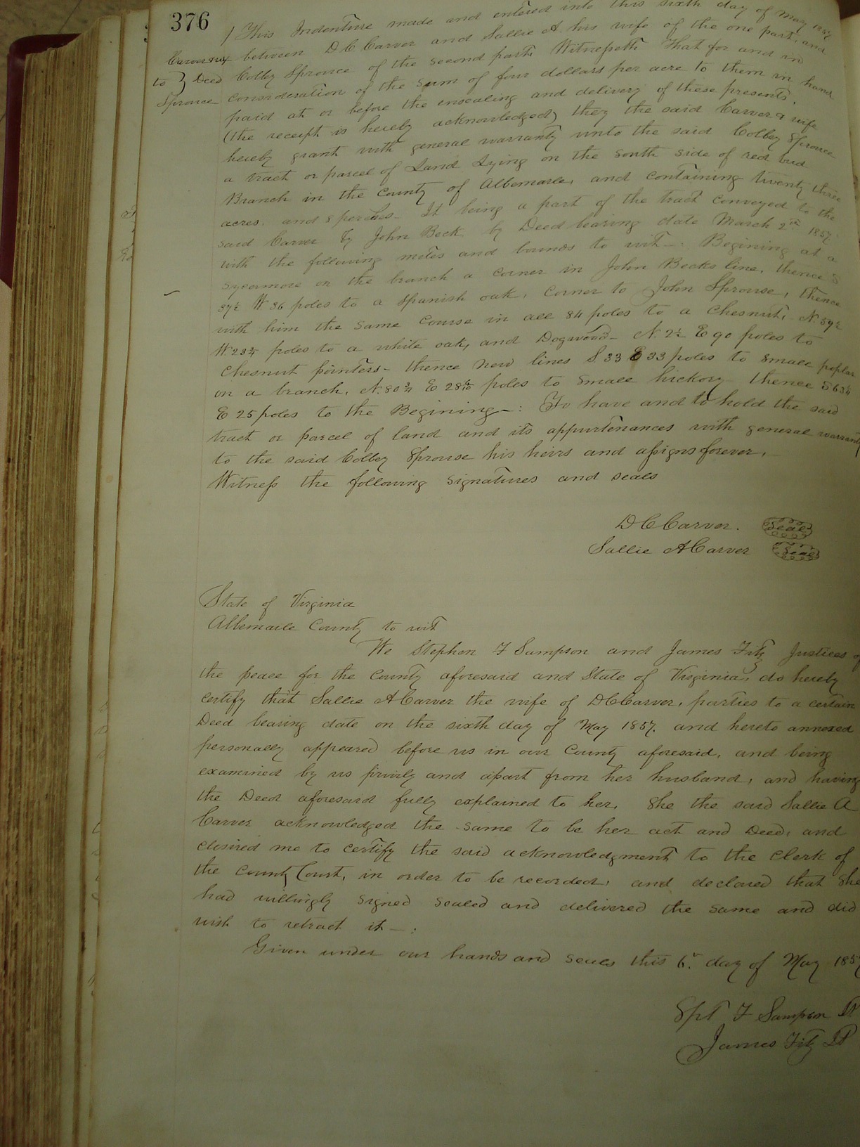Whereas JOHN SPROUSE sometime since purchased of D. C. Carver certain tract of land, lying in the County of Albemarle, containing twenty four and a half acres, and adjoining the lands of William T. Miner, Frank Nelsen, and others and whereas the said John Sprouse made the said purchase with the common fund of and for the common benefit of WESTON SPROUSE, SHELTON SPROUSE, CELARY SPROUSE, BURLY SPROUSE, MATILDA SPROUSE, GIDEON SPROUSE, COLBY SPROUSE, CORNELIUS CARVER, BENJAMIN BELLAMY and himself, and whereas the said Colby Sprouse has purchased the several interests of the said JOHN, WESTON, SHELTON, CELANY, BURLEY, MATILDA, GIDEON SPROUSE and the said Cornelius Carver and Benjamin Belleamy, and whereas by an agreement between all the parties. The title to the said land has been direly conveyed to the said Colby Sprouse by the said D. C. Carver, and whereas the said Colby Sprouse is desirous of securing to his said brothers and sisters the payment of the purchase money for said land. Now therefore this deed made this 23rd day of August in the year 1859 between Colby Sprouse of the County of Albemarle and the State of Virginia, of the one part, and D. C. Carver, of the said county and state of the other part. Witnesseth, that the said Colby Sprouse doth grant unto the said D.C. Carver then the following property, to wit. A certain tract or parcel land lying in the County of Albemarle containing twenty four and a half acres, adjoining the lands of William T. Miner, Frank Nelson, and others being the same land above described also one bay mare. In trust, to secure to Weston Sprouse, Shelton Sprouse, Celany Sprouse, Burley Sprouse, Matilda Sprouse, John Sprouse, Gideon Sprouse, Cornelius Carver and Benjamin Bellamy. The payment of a certain bound executed by the said Colby Sprouse bearing date of the 23rd day of August 1859, and being for the payment of $290 on the 1st day of January 1860 to be equally divided between them.