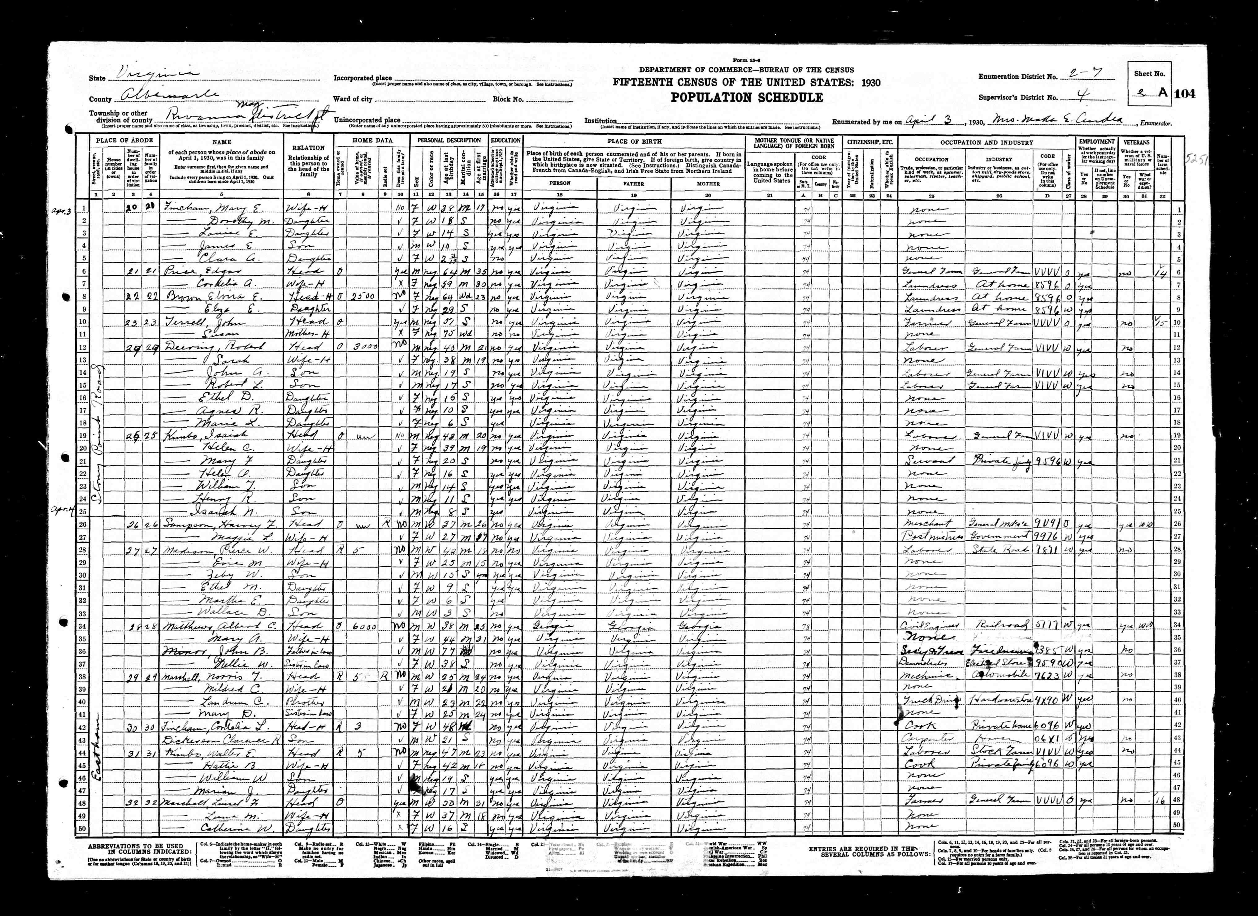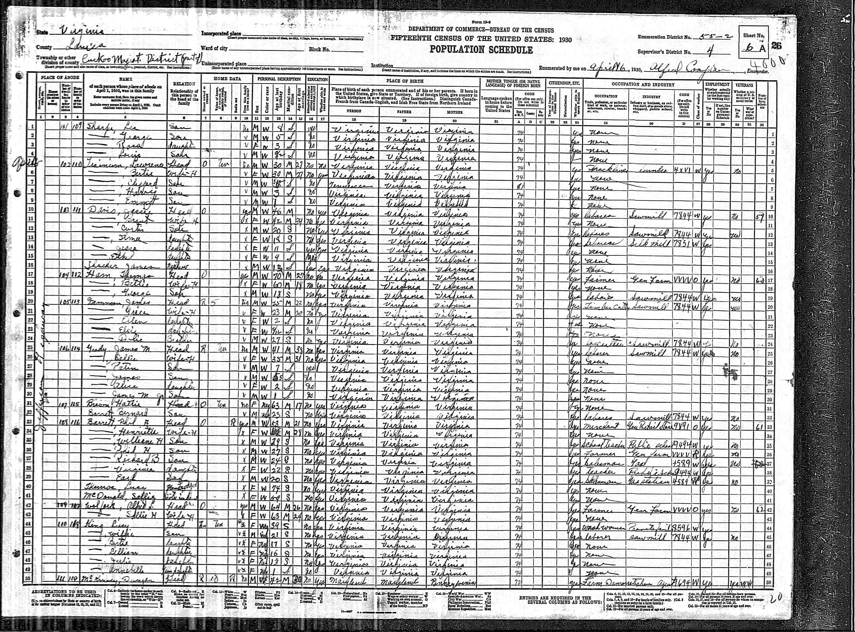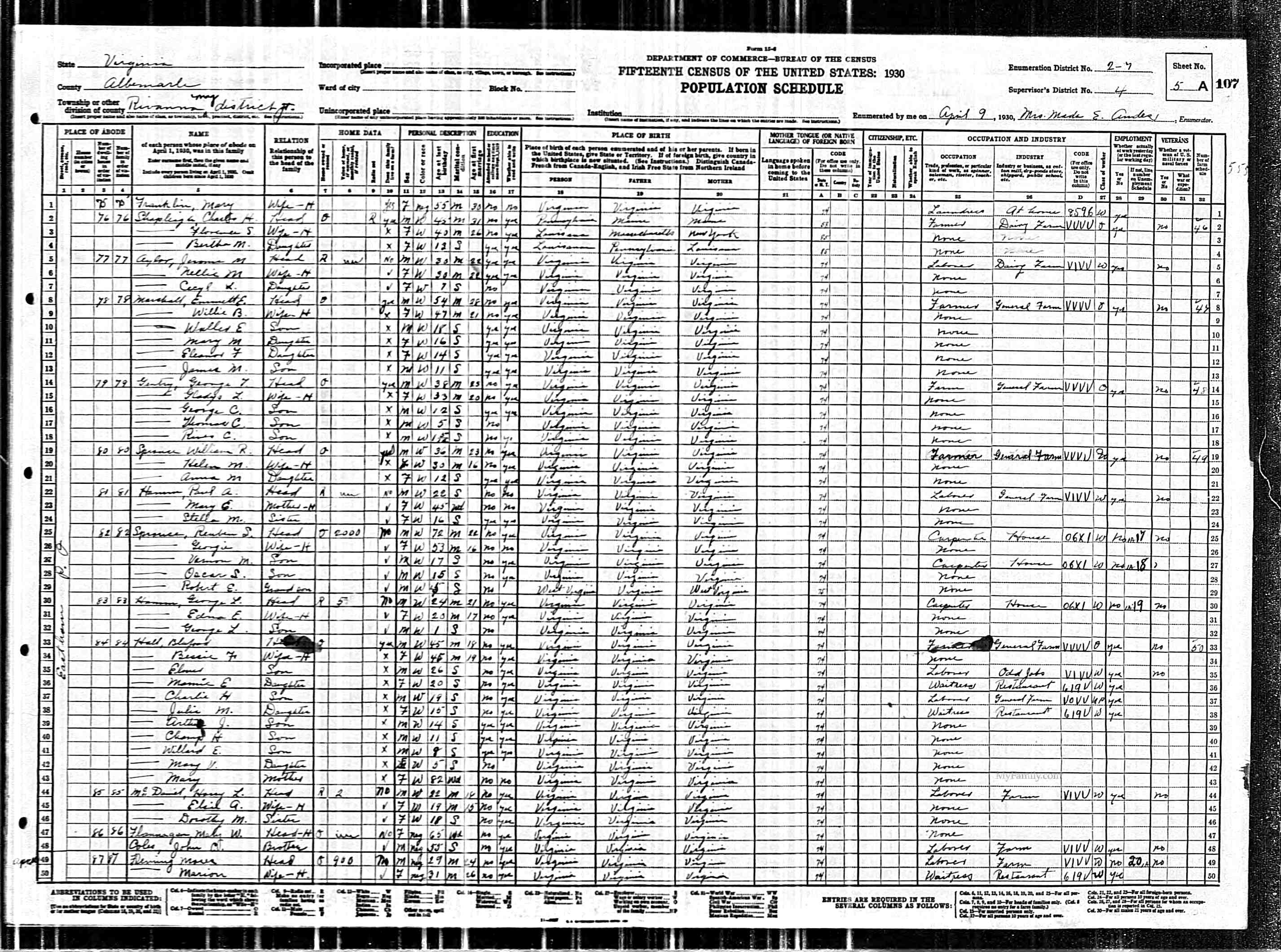 877. 1930 Virginia Census, Albemarle, Rivanna, ED 6, Sht 4B.