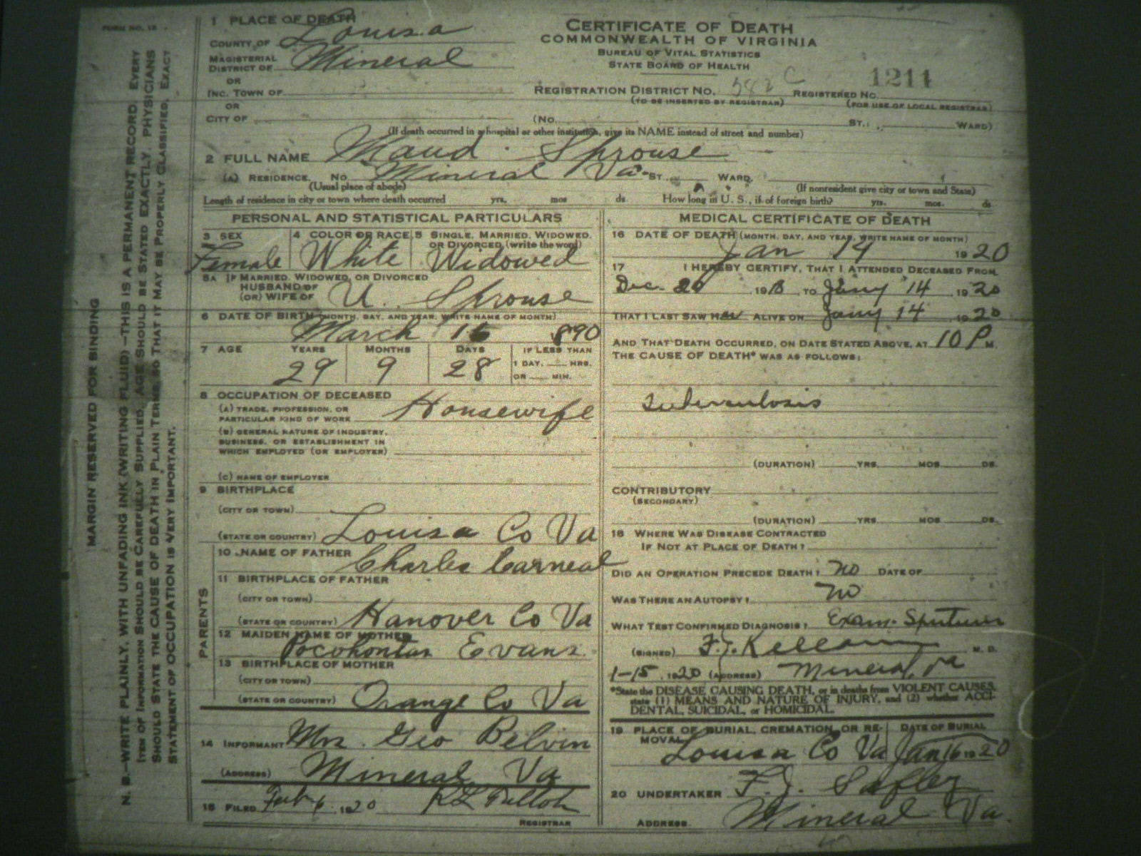 6. Census: Willie Sprouse and family, 15 Jan 1920, Mineral, Louisa County, Virginia, USA. 224