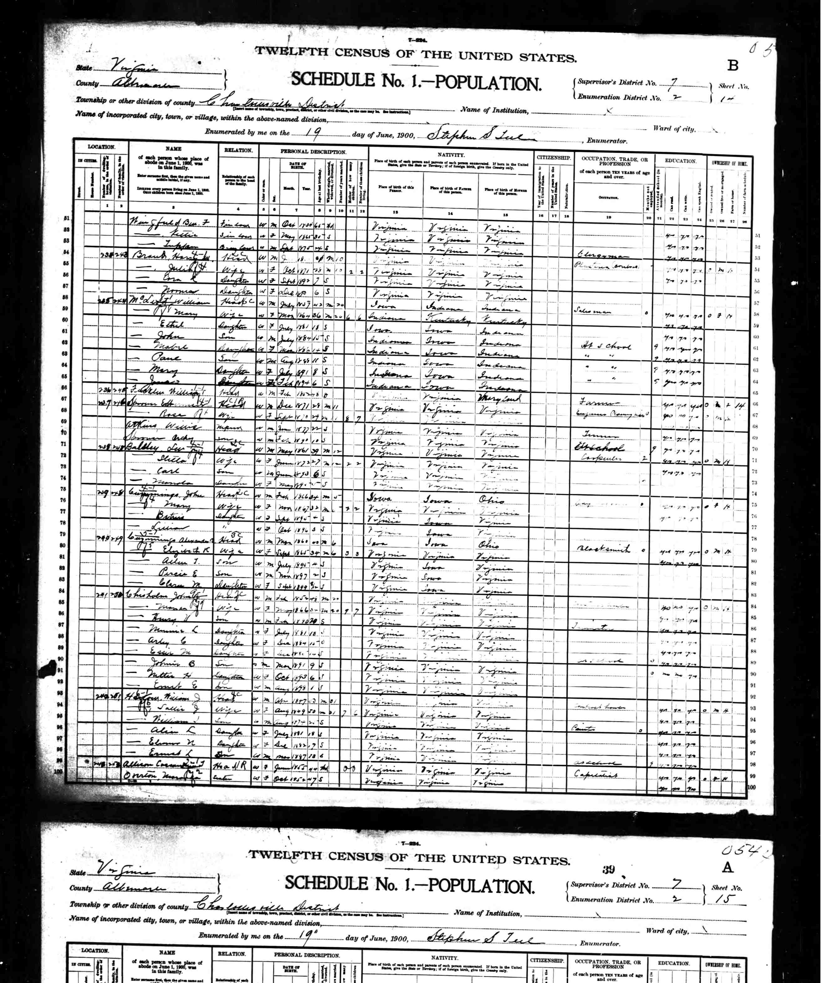 2. Census: James Thomas Sprouse and family, 11 Jun 1900, Pastures, Augusta County, Virginia, USA. 538