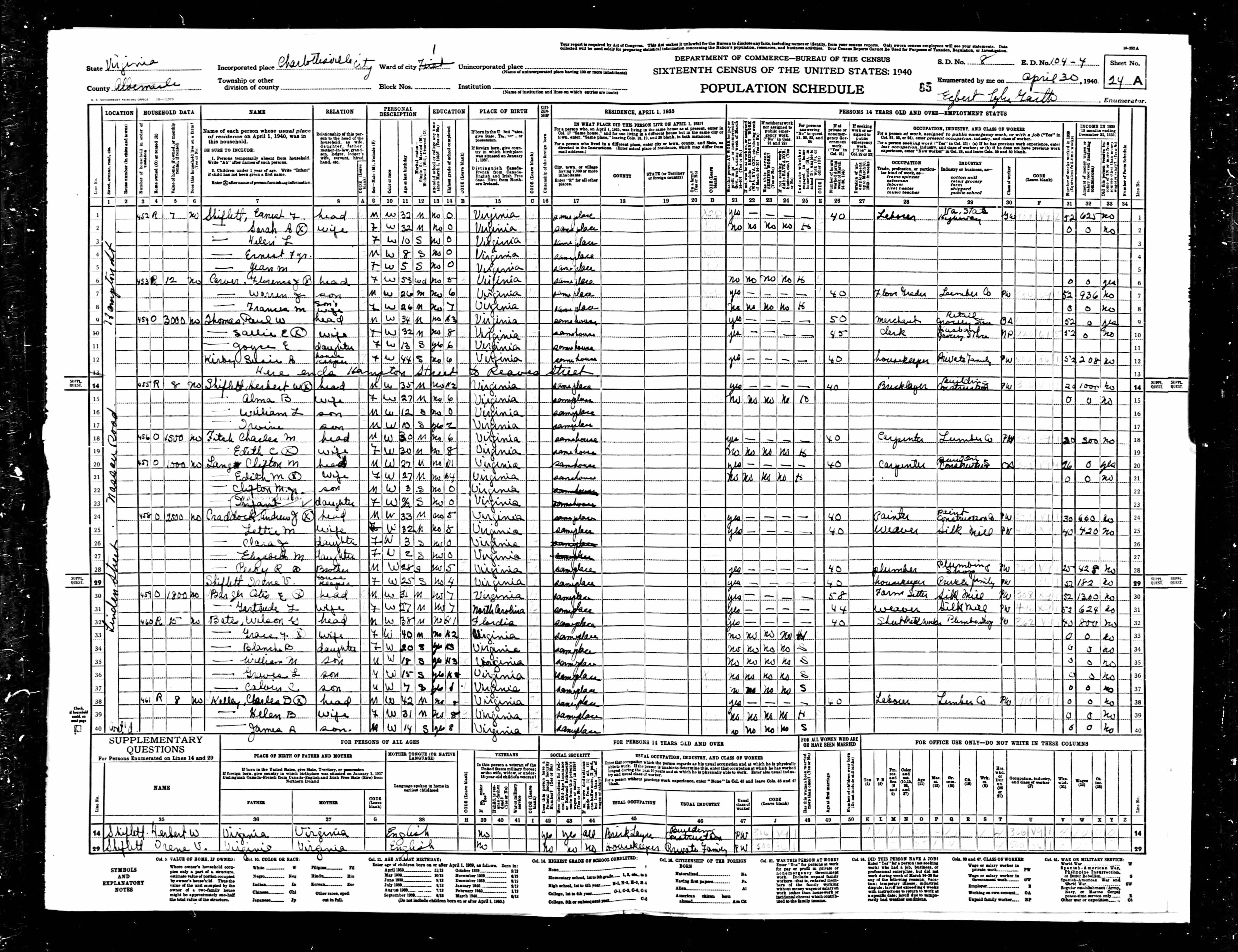 881. 1940 Virginia Census, Charlottesville City, Charlottesville ED 104-3, Sht 2B, Image 4 Roll T627.