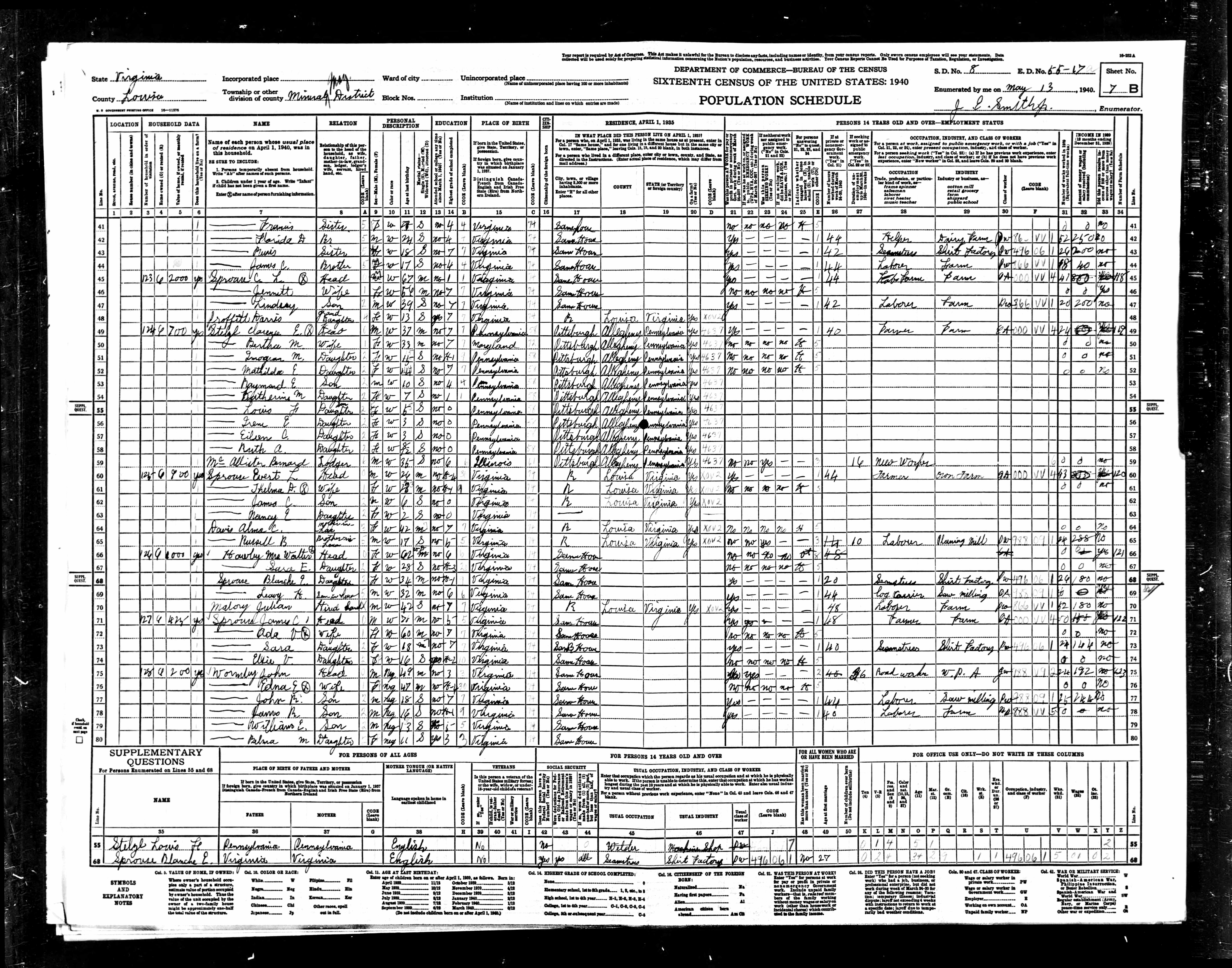 2. Census: Arthur Sprouse and family, 15 May 1940, Pastures, Augusta County, Virginia, USA. 531