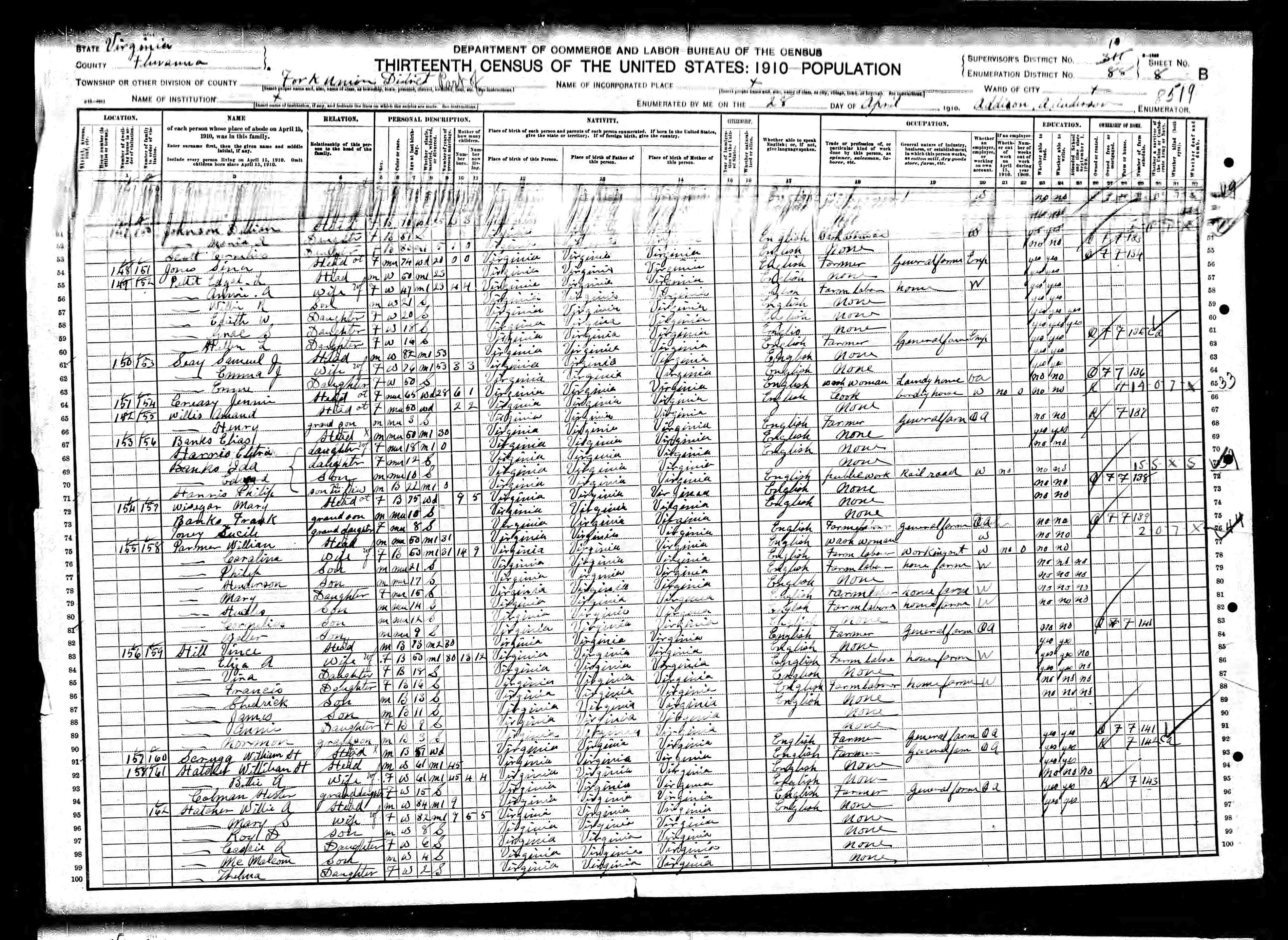 5. Occupation: 1910 Census General Farmer, 22 Apr 1910, Mineral, Louisa County, Virginia, USA. 545