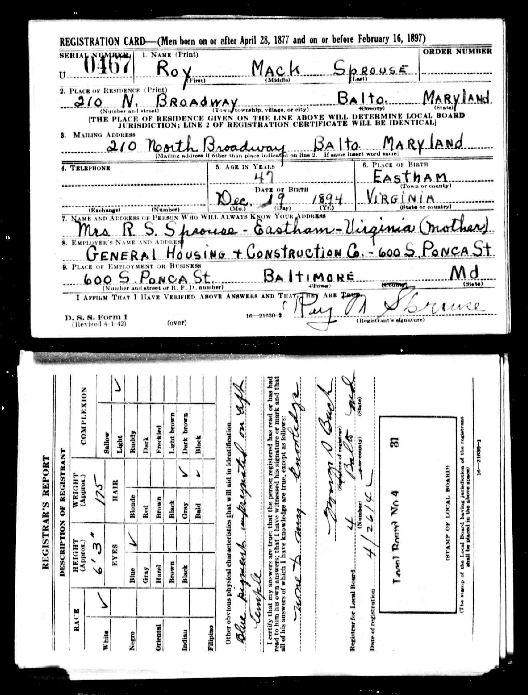 871. World War II Draft Registration Cards, 1942, Lawrence Raymond Sprouse.