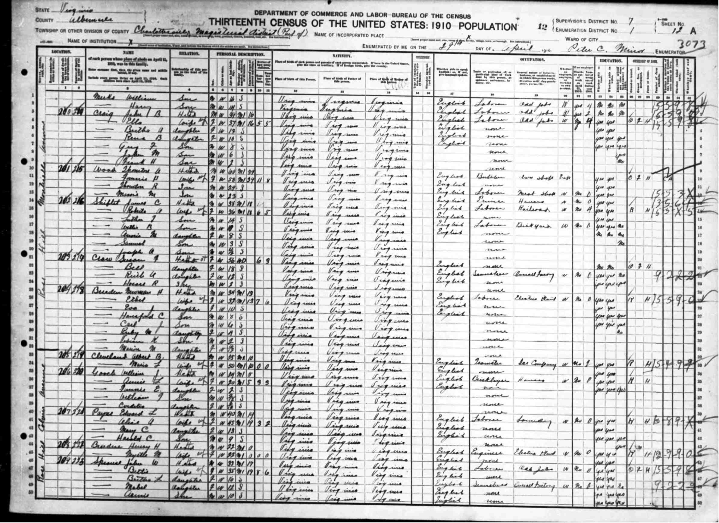 2. Census: Linwood Carver and family, 23 Apr 1910, Charlottesville, Albemarle County, Virginia, USA. 211