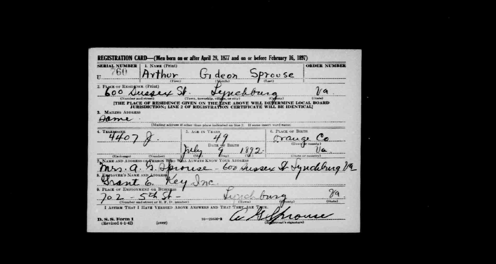 859. World War II Draft Registration Cards, 1942, Arthur Gideon Sprouse WWII Draft Registration Card.