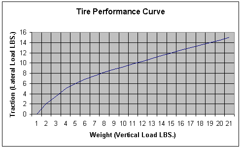 To determine how a car will handle, it is important to understand how the tires translate input into output. These are the tire performance curves and show how the amount of weight (vertical load) on a tire produces a certain amount of traction (lateral load). It is important to note here that as weight increases so does traction, but increase in traction becomes less and less as weight is increased. Read that sentence again. Sounds contradictory the first time doesn't it? What it is saying is, for example, the increase in lateral load (traction) from 0-5 lbs vertical load (weight) will be greater than the increase in lateral load from 5-10 lbs vertical load. This is known as the tires "loss in cornering efficiency." A hypothetical tire performance curve is shown in Figure 1.
