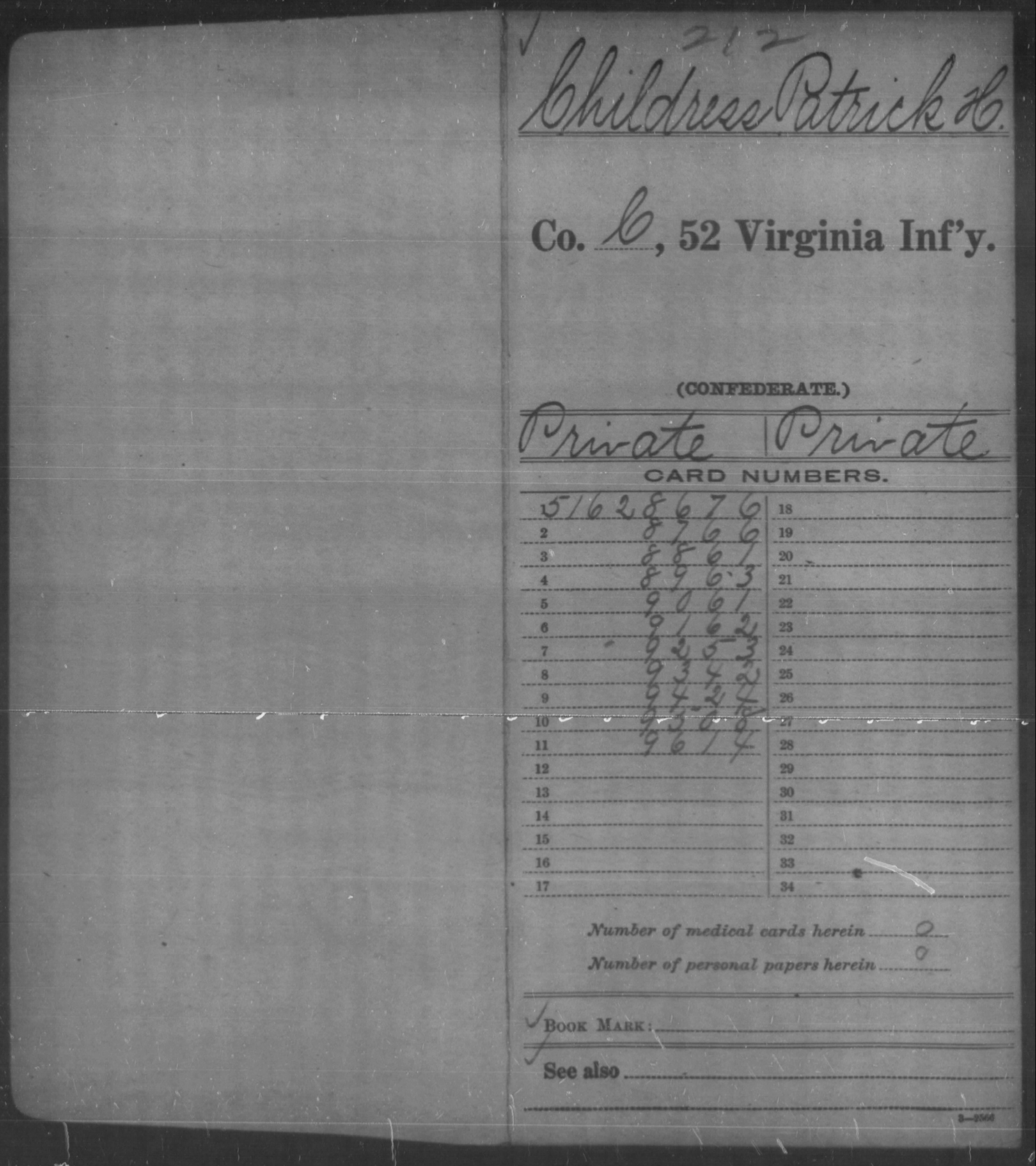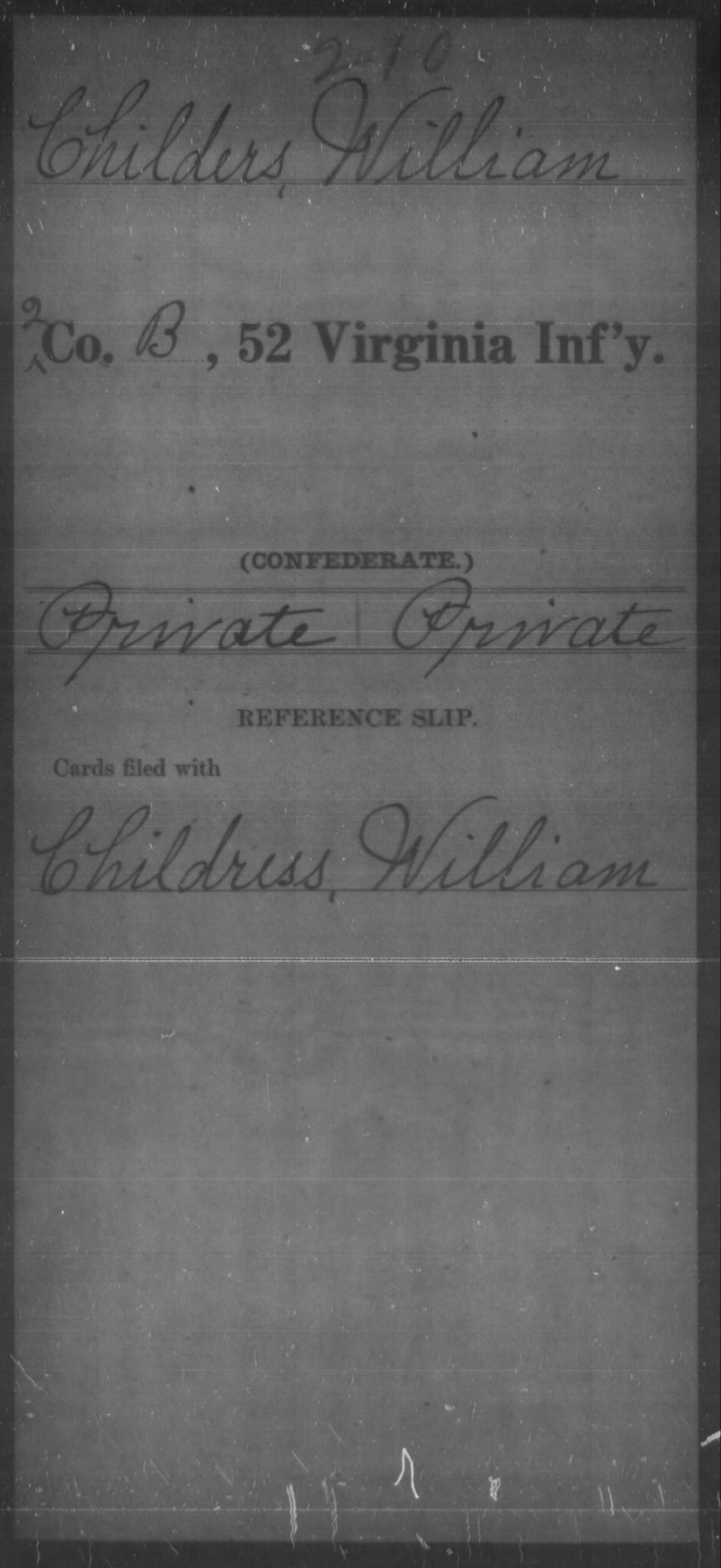 "Childress, Patrick Henry: Pvt Co. C, B, Augusta Co., 12/12/1832, Millwright, Augusta Co, Enl Staunton 7/16/1861 age 20, Present 11/61 - 04/62; reenl 5/1/62; WIA Cedar Run, left thigh 8/9/62, absent wounded until discharged wounds and permanent disease of the spine and spermatonhuas, "Richmond 10/17/1862, age 27, 5'10, fair complexion, eyes gray, hair brown, Millwright, age 37, Fisherville PO, Augusta Co, 1870 census. Died South River District 5/4/1914 Augusta Co., Buried Thornrose Cemetery, Staunton." [Film M382 Roll 10]