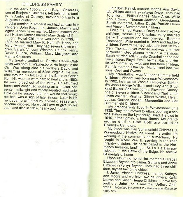 59. Various, Augusta County, Virginia Heritage Book 1732-1998 (Published by the Augusta Heritage Book Committee, P.O. Box 1005, Staunton, Virginia in 1999.), Article Written on Patrick Henry Childress.