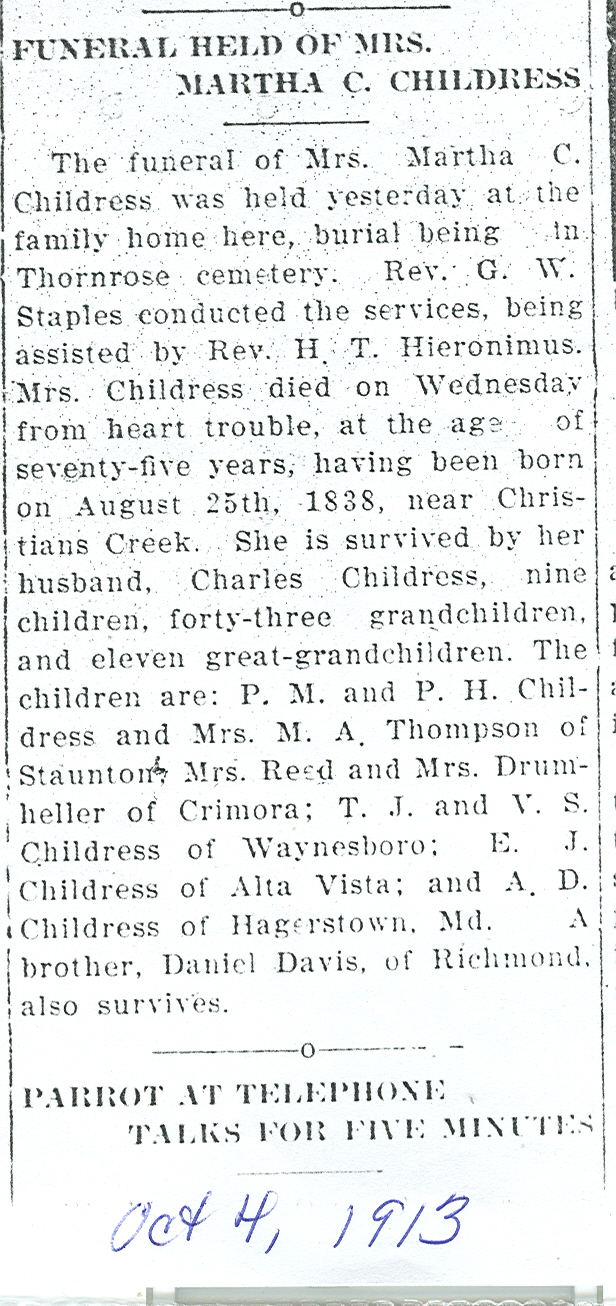 67. Obituary from Waynesboro, VA Newspaper, Vincent Summerfield Childress. Vincent Summerfield Childress died at his home near Afton, at 4:17 a.m. today, at the age of 71, after an extended illness. He was born in Augusta County Dec. 12, 1877, and lived in Waynesboro until 1935 when he moved to near Afton where he was proprietor of a service station on the Lynchburg road. He is survived by his widow, Yhorlia Barker Childress; three daughters, Mrs. Virginia C. Stone, Waynesboro; and Mrs. Floyd W. Gray and Mrs. Marguerite C. Brown, both of Afton; one son, Carl S. Childress of Afton; and two brothers, Patrick H. Childress, of Waynesboro and A. D. Childress, of Hagerstown, Md. Also six grandchildren, Mrs. Thomas A. Halter, Miss Alice Gray, Miss Jo Anne Gray, Donnie Gray, and Carl Allen Brown, all of Afton, and Woodrow W. Stone, of Waynesboro; and one great-grandchild, Charles Stone, of Waynesboro. Pallbearers will be Henry Pannell, Earl Barker, Solon Barker, Austin Pannell, Preston Barker and Walker Barker. Funeral will be held at 2 p.m. Monday in the chapel of the Etter Funeral Home, under the direction of Rev. B. F. Robinson. Interment will be in Riverview Cemetery.