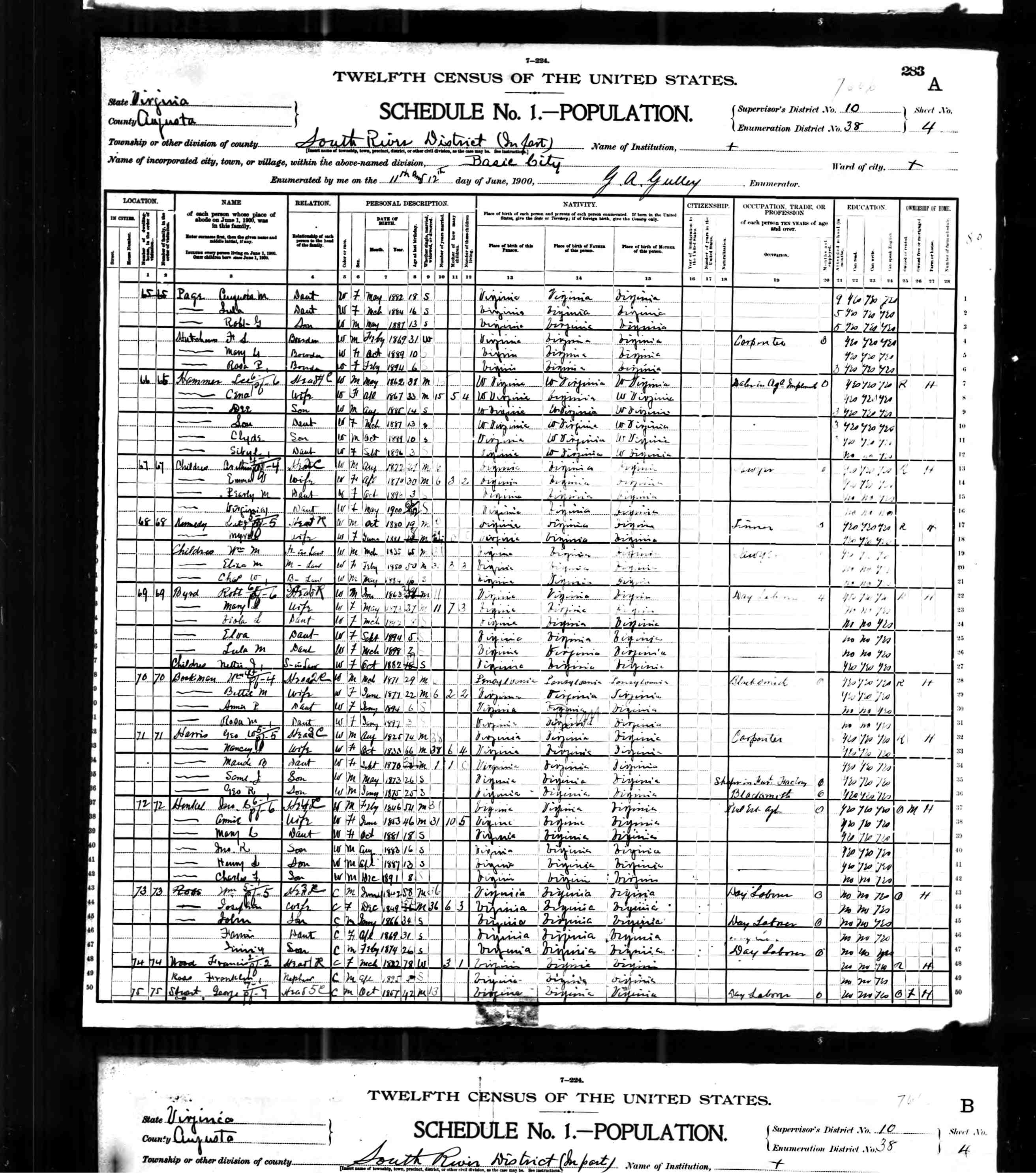 55. 1900 Virginia Census, Augusta, South Rver, ED 39, Sht 12B.