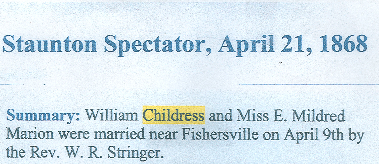 113. Newspaper Marriage Announcement, William and E. Mildred Marion. Married near Fisherville 9 Apr 1868 by rev. W.R. Stringer.