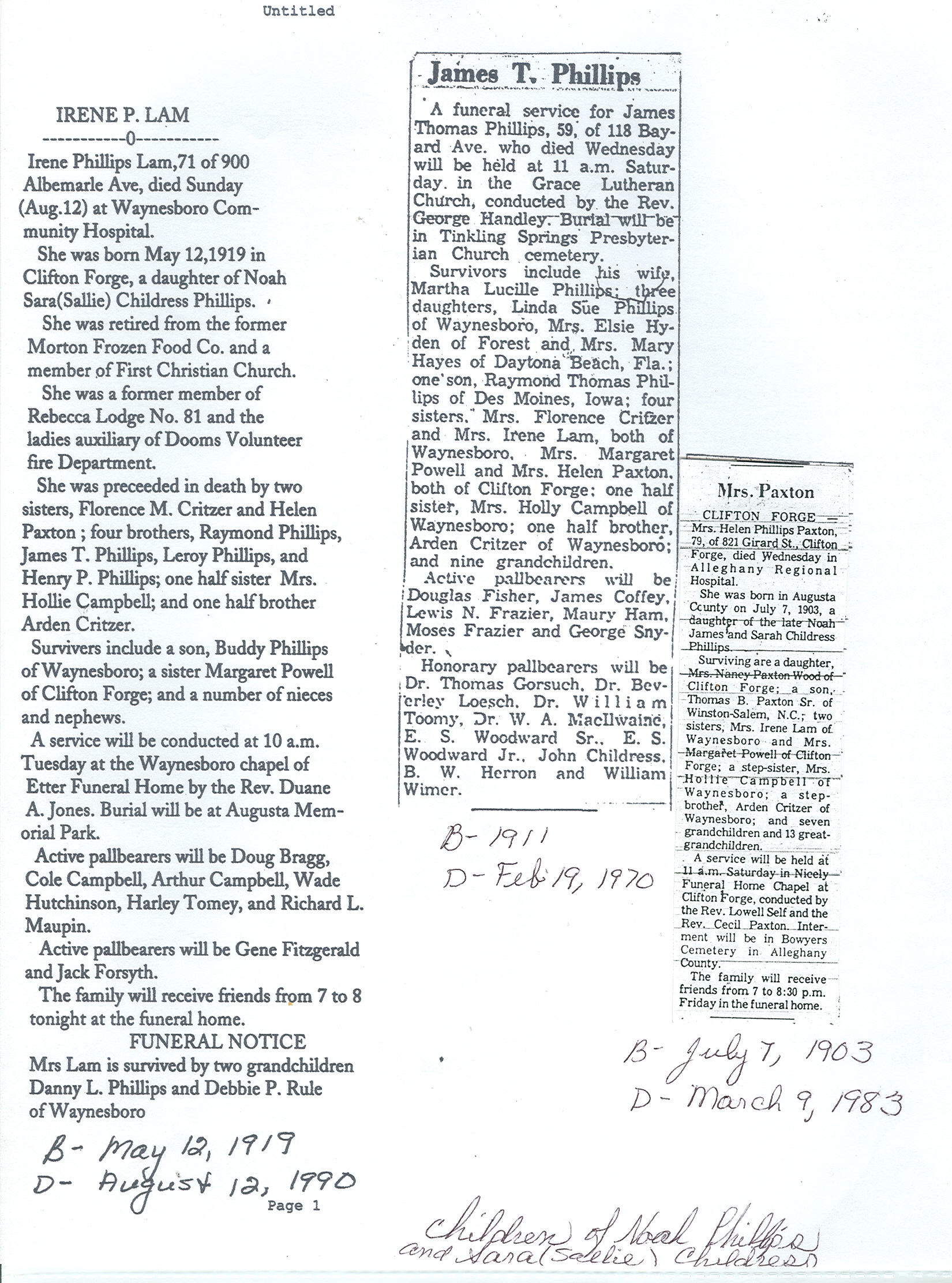 + 90 v. Irene Phillips was born on 12 May 1919 in Clifton Forge, Alleghany County, Virginia, USA, died on 12 Aug 1990 in Waynesboro, Augusta County, Virginia, USA,145 at age 71, and was buried on 14 Aug 1990 in Augusta Memorial Park, Craigsville, Augusta County, Virginia, USA.