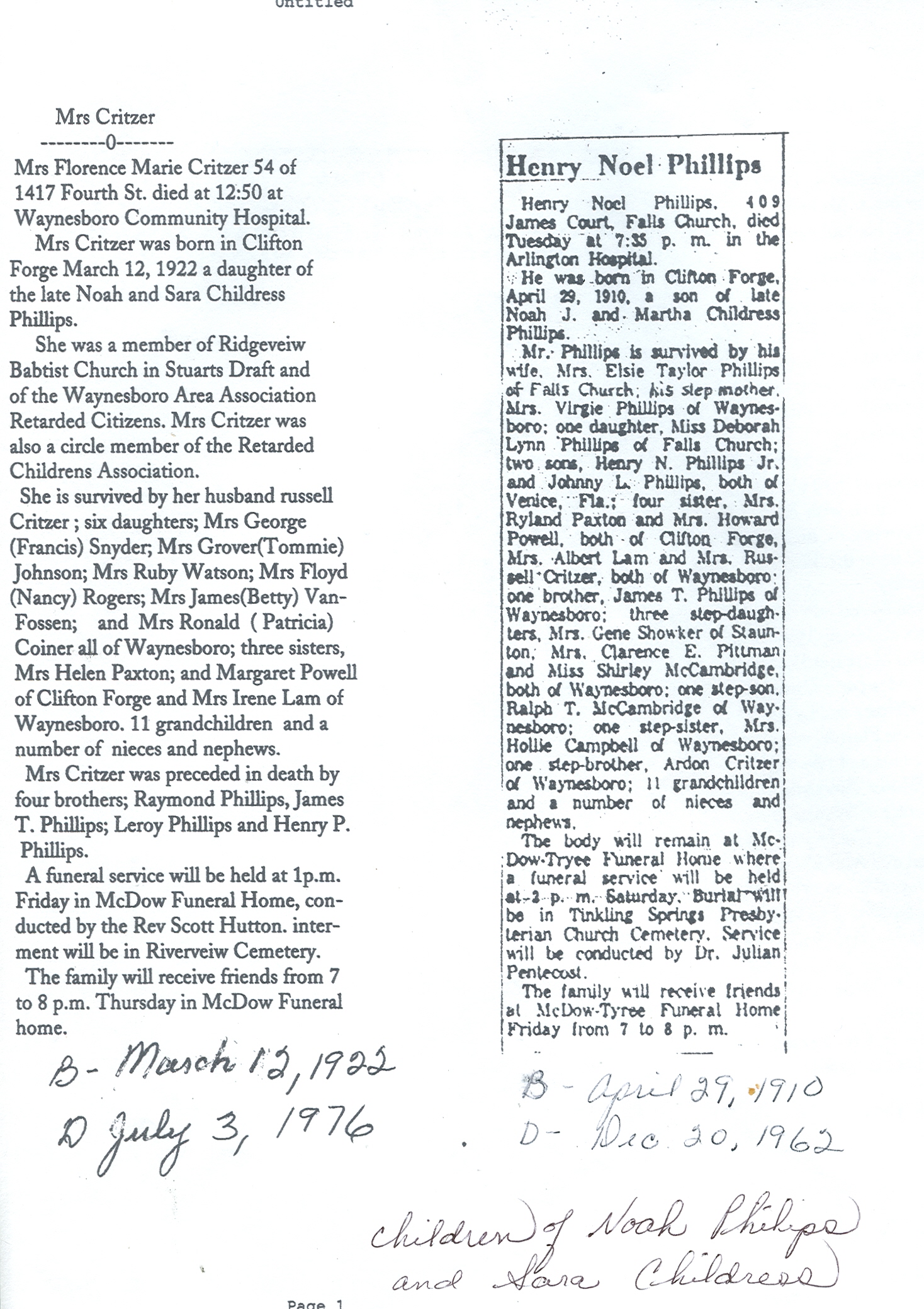 + 91 vi. Florence Marie Phillips was born on 12 Mar 1922 in Clifton Forge, Alleghany County, Virginia, USA, died on 3 Jul 1976 in Waynesboro, Augusta County, Virginia, USA,146 at age 54, and was buried on 9 Jul 1976 in Riverview Cemetery, Waynesboro, Augusta County, Virginia, USA.