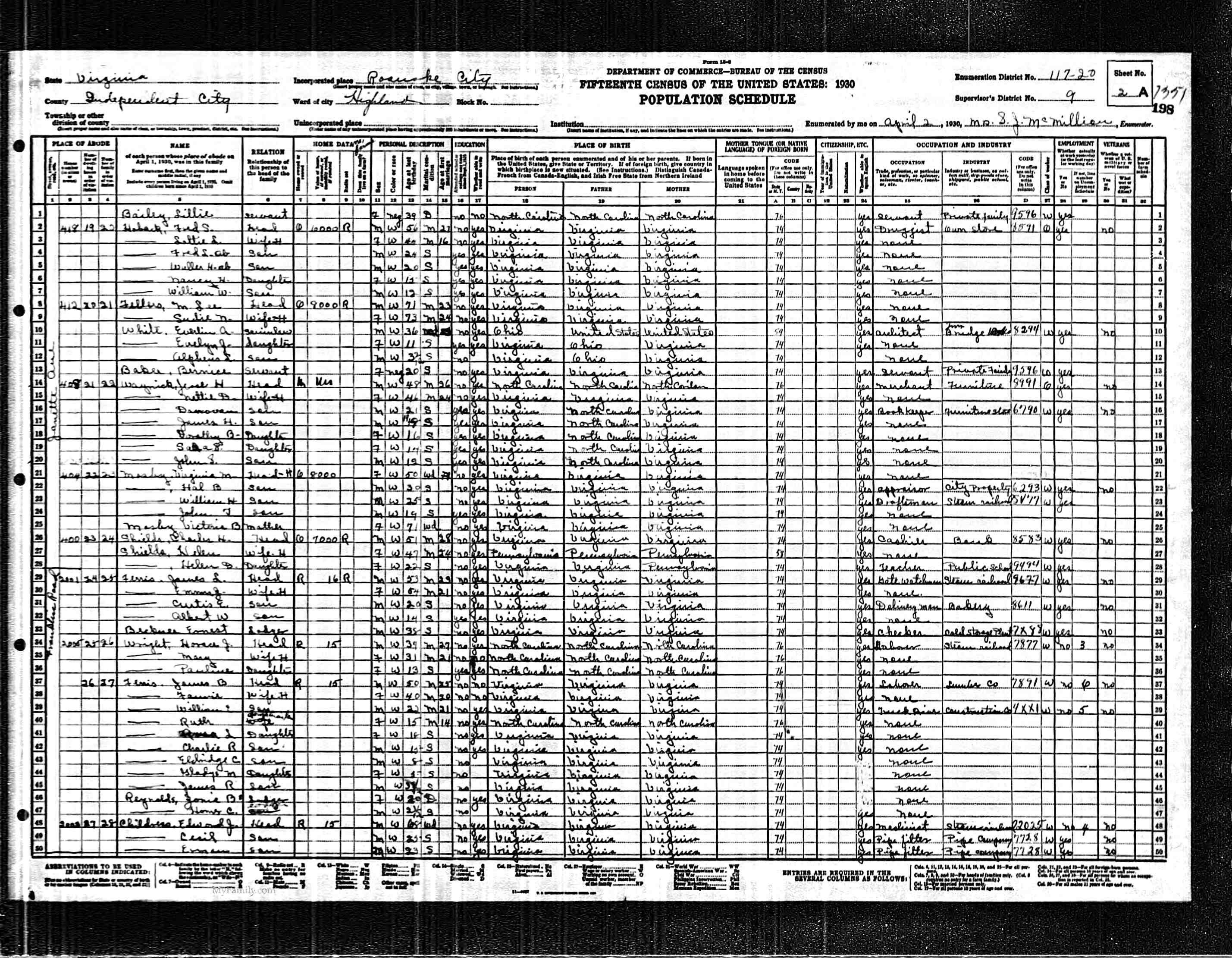 11. Census: Edward Johnson Childress and family, 2 Apr 1930, Roanoke, Roanoke (city), Virginia, USA. 157