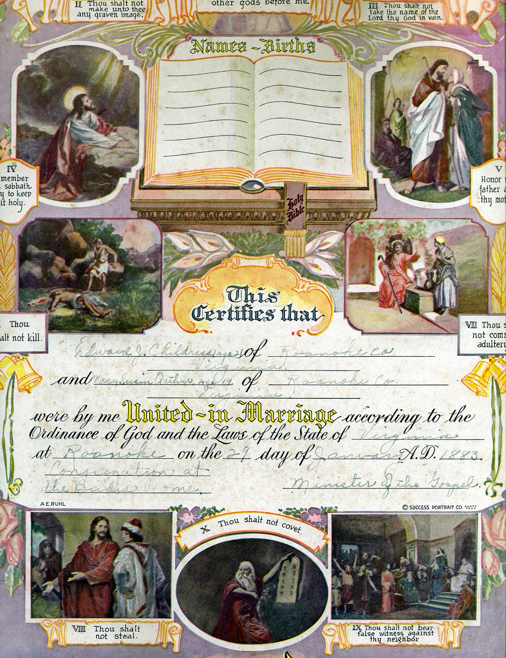 Edward married Mary Susan Arthur, daughter of Granville Arthur and Frances A. Dayton, on 29 Jan 1883 in Roanoke, Roanoke (city), Virginia, USA.158 Mary was born on 27 Jan 1863 in Roanoke County, Virginia, USA, died on 25 Jan 1914 in Altavista, Campbell, Virginia, USA,159 at age 50, and was buried on 27 Jan 1914 in Evergreen Cemetery, Roanoke, Roanoke (city), Virginia, USA. The cause of her death was Cancer of uterus.