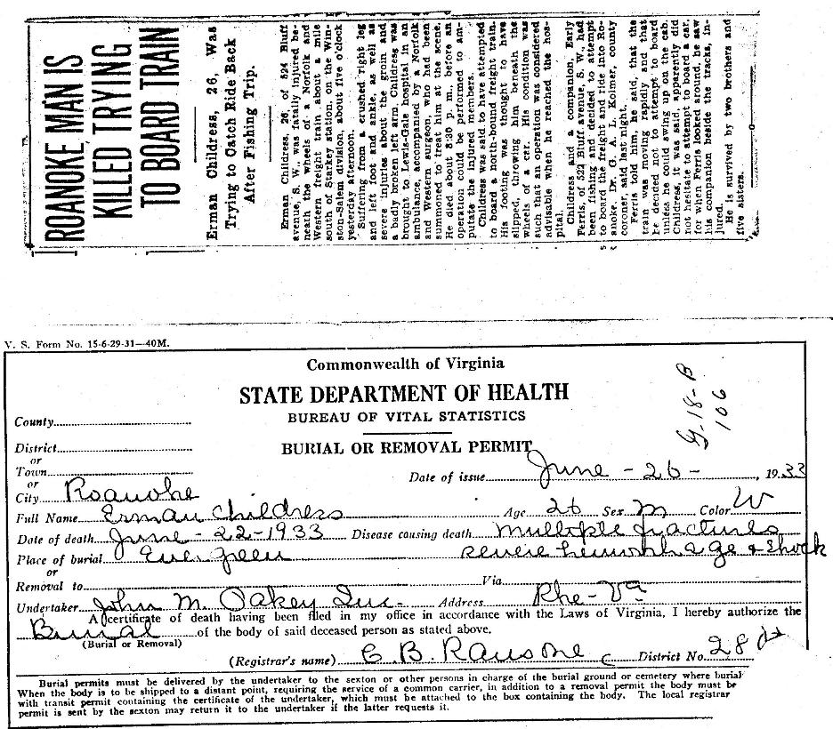 + 115 viii. Erman Childress was born about 1907 in Albemarle County, Virginia, USA, died on 22 Jun 1933 in Roanoke, Roanoke (city), Virginia, USA,161 about age 26, and was buried on 26 Jun 1933 in Evergreen Cemetery, Roanoke, Roanoke (city), Virginia, USA.