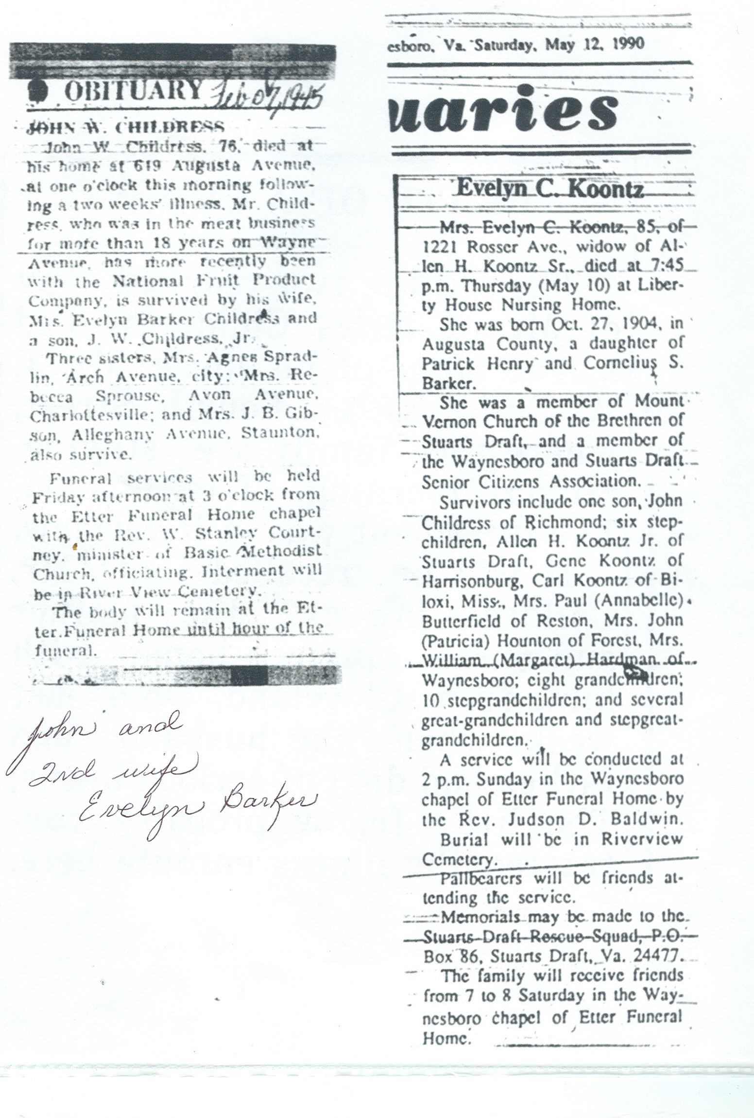 308. Obituary from Waynesboro, VA Newspaper, Della V. Childress.