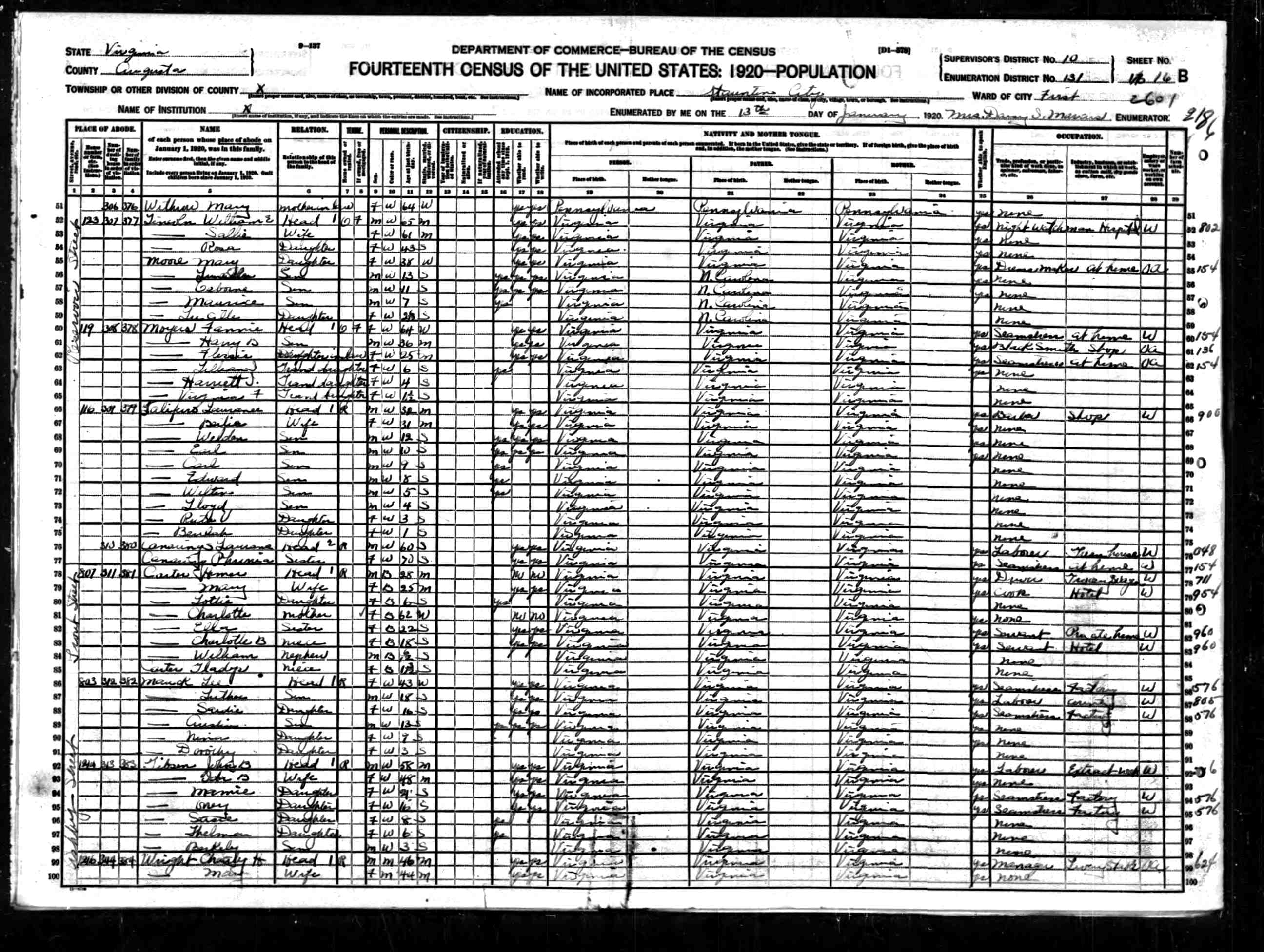 218. 1920 Virginia Census, Augusta, Staunton, Staunton Ward 1, ED 131, Sht 16B.