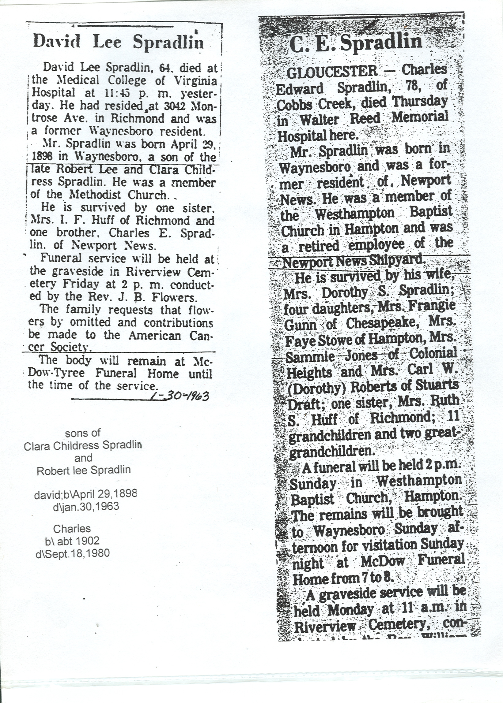 224. Obituary from Waynesboro, VA Newspaper, Charles Edward Spradlin.