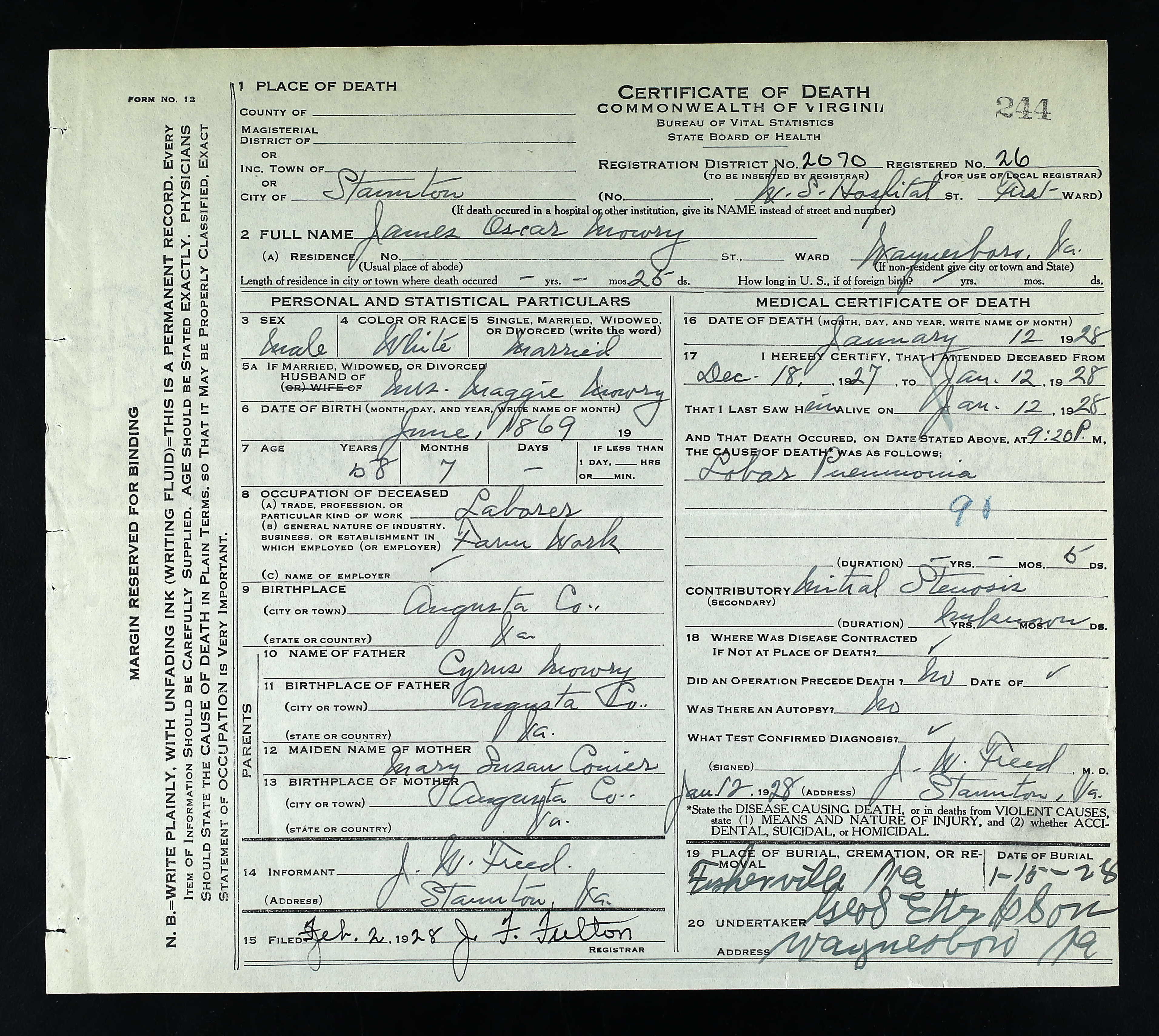 1. Alt. Birth: Death Certificate, 27 Jan 1862, Staunton, Augusta County, Virginia, USA.