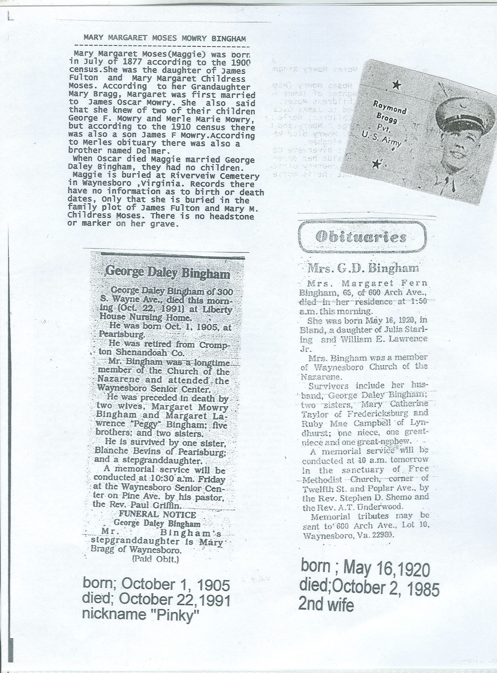 289. Obituary from Waynesboro, VA Newspaper, George Daley Bingham.