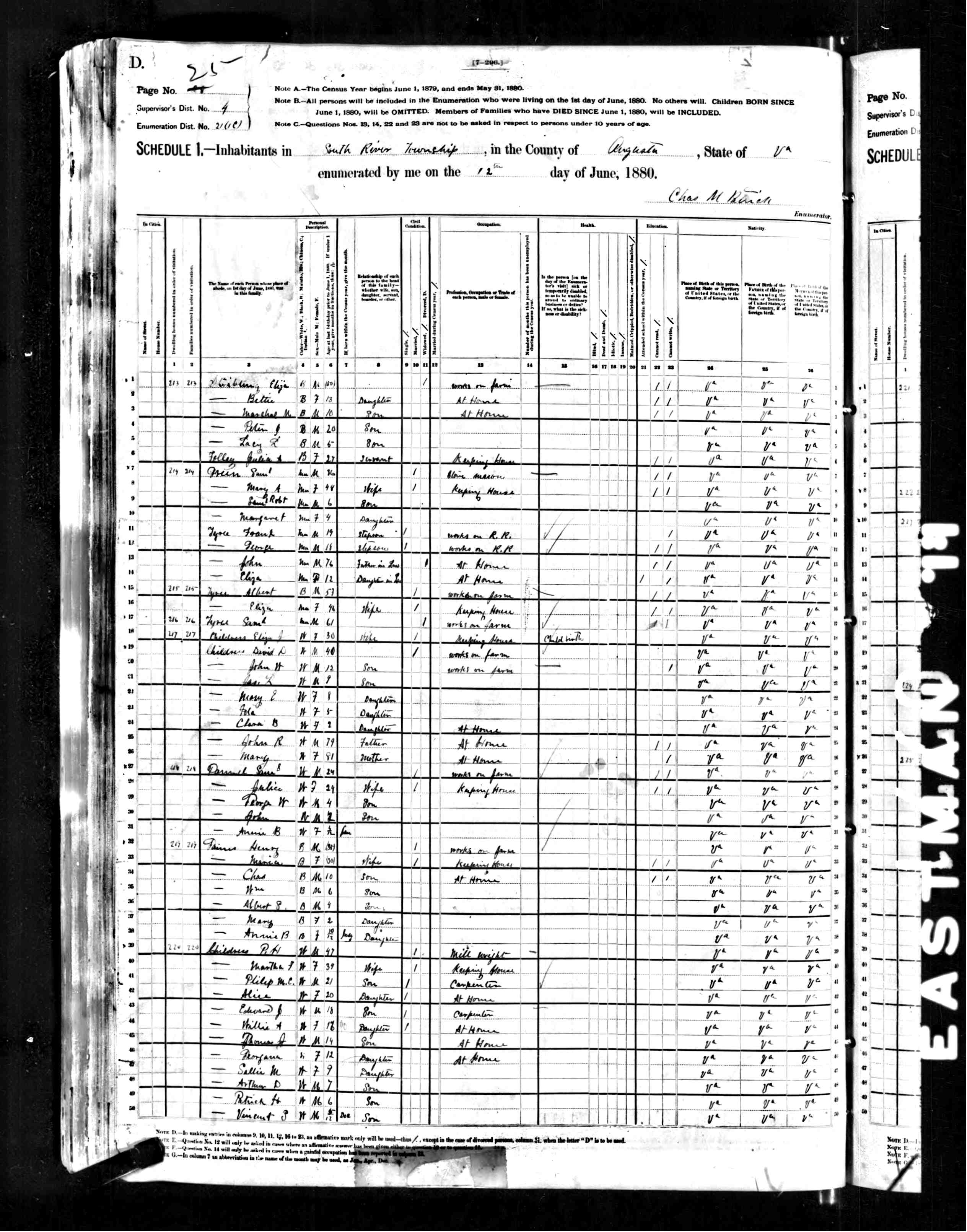 2. Census: Patrick Henry Childress and family, 12 Jun 1880, South River, Augusta County, Virginia, USA. 50