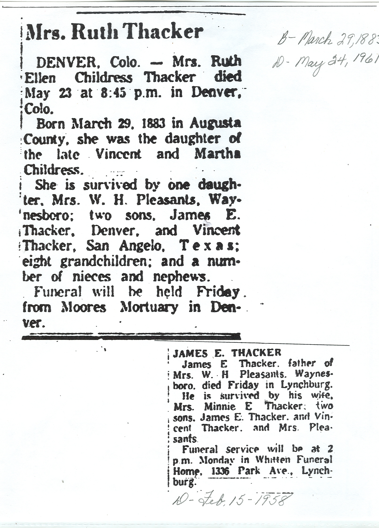 Ruth married James E. Thacker on 19 Jun 1904 in Augusta County, Virginia, USA. James was born about 1882 in Albemarle County, Virginia, USA and died on 15 Feb 1958 in Lynchburg, Lynchburg (city), Virginia, USA,137 about age 76.