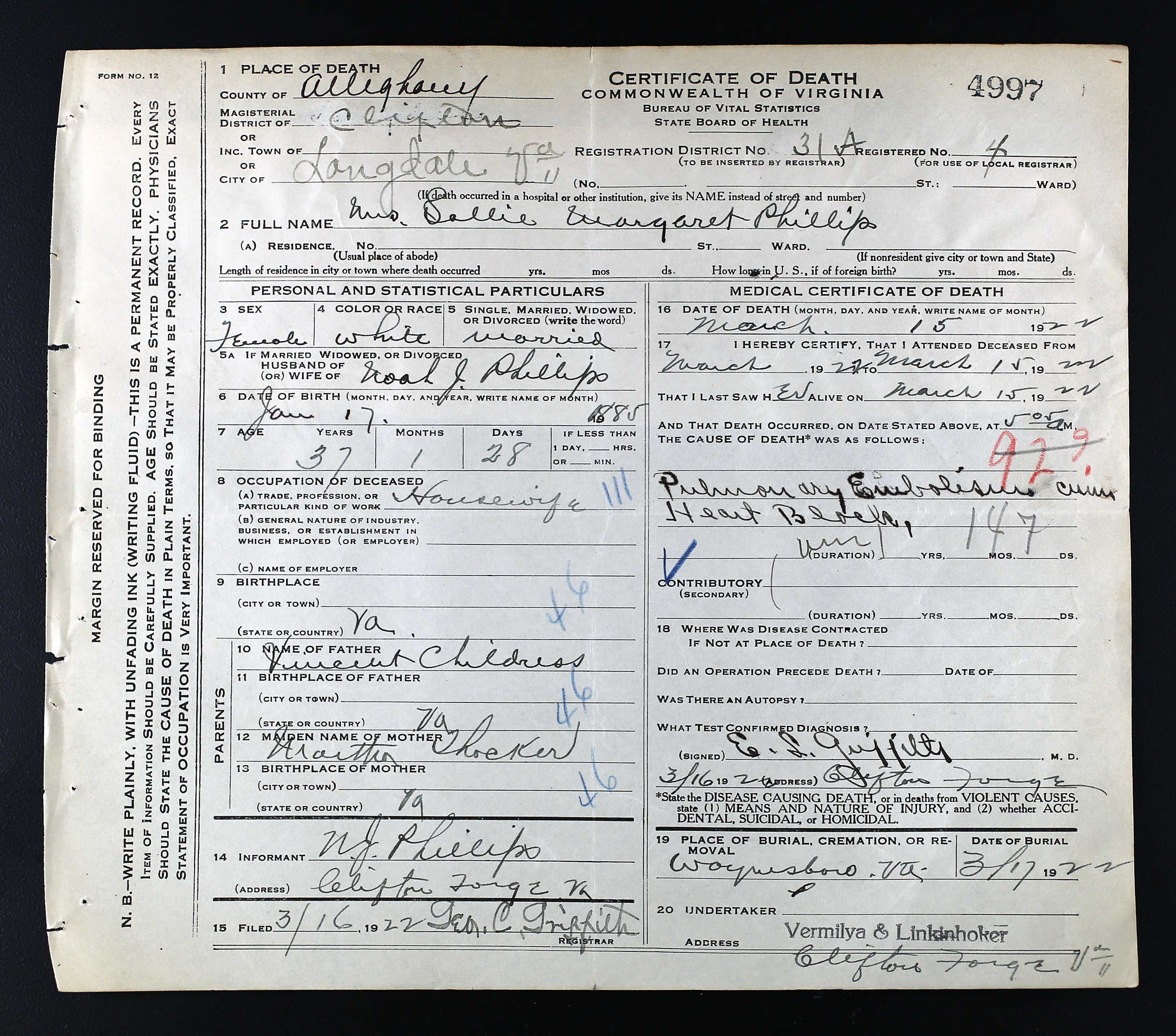 27. Sarah Margaret "Maggie" Childress was born on 17 Jan 1885 in Albemarle County, Virginia, USA, died on 15 Mar 1922 in Longdale, Alleghany County, Virginia, USA,47 at age 37, and was buried on 17 Mar 1922 in Waynesboro, Augusta County, Virginia, USA.