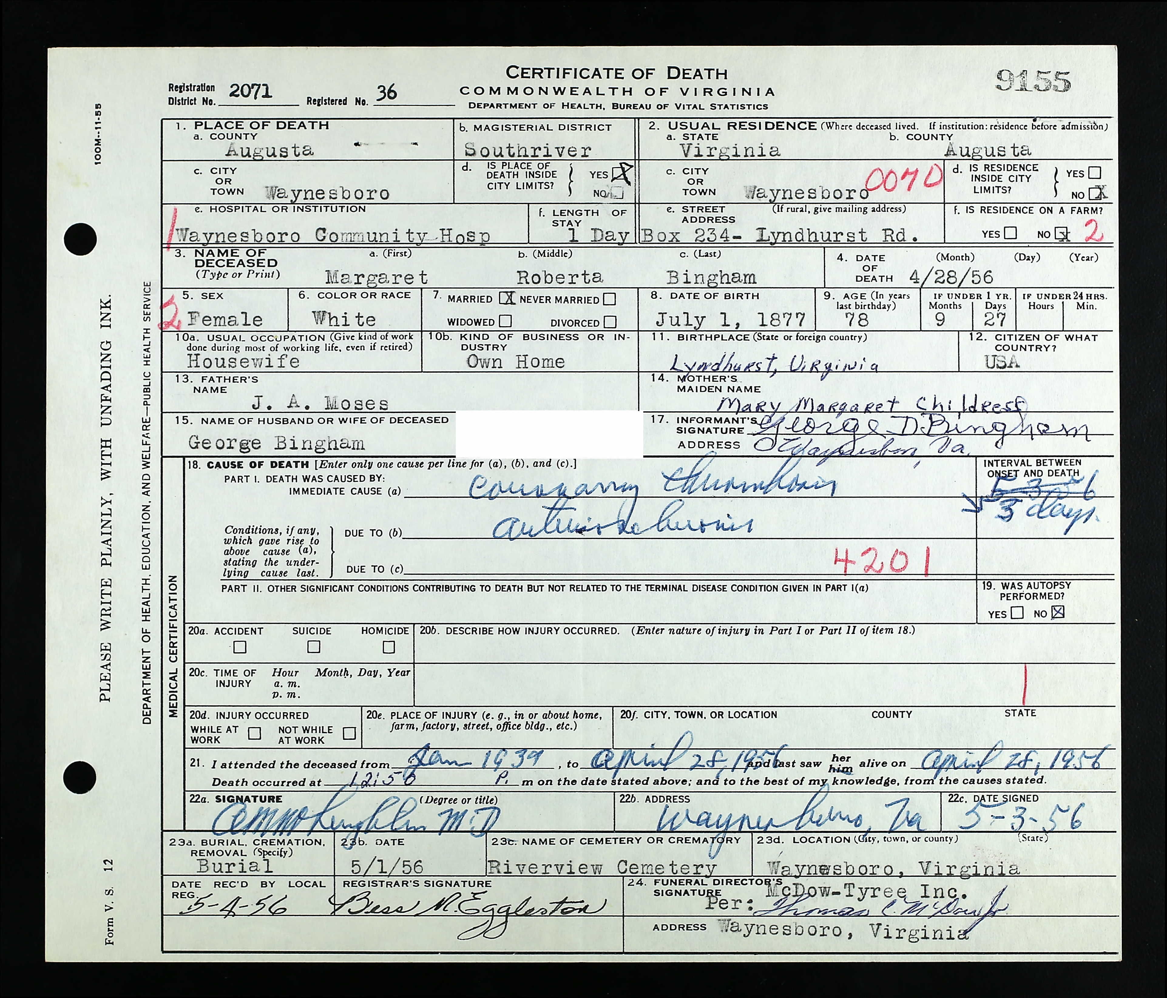 + 93 ii. Homer Marion Childress was born on 15 May 1886 in Waynesboro, Augusta County, Virginia, USA, died on 16 Apr 1959 in Waynesboro, Augusta County, Virginia, USA, at age 72, and was buried in Riverview Cemetery, Waynesboro, Augusta County, Virginia, USA.