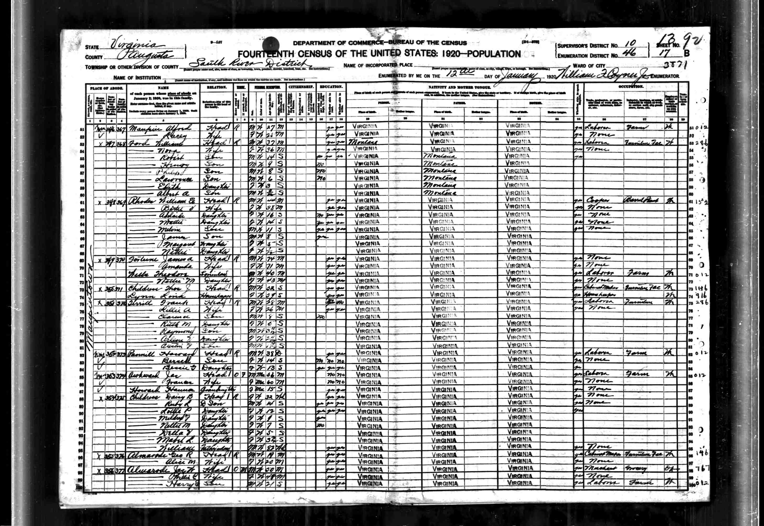 227. 1930 Virginia Census, Augusta, South River, ED 17, Sht 10B, Image 20 Roll 2435, p. 10B, ED 17, Image 804.