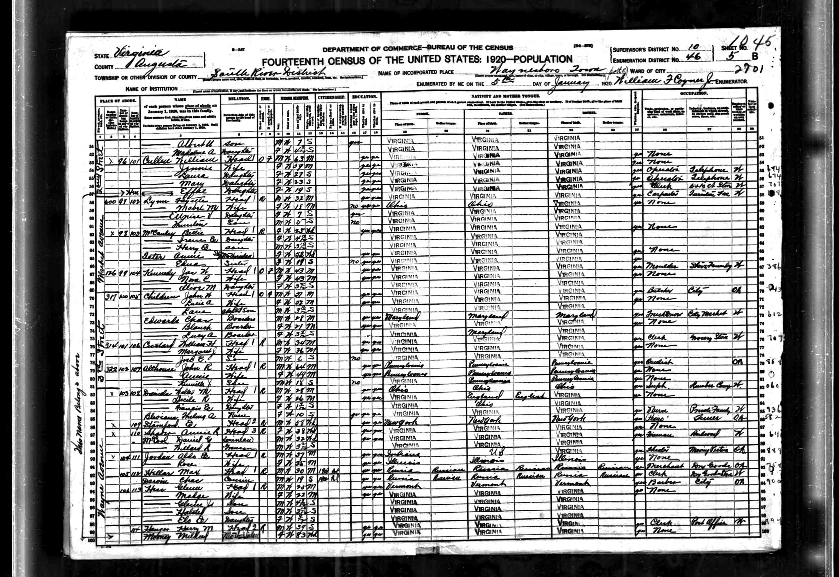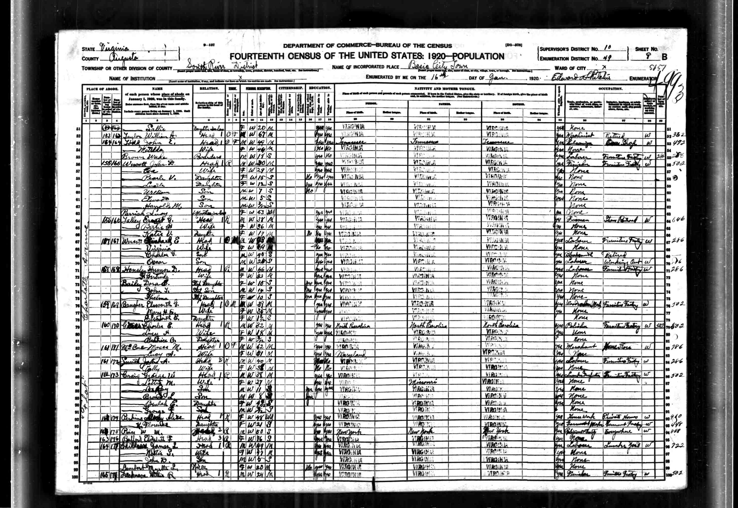 449. 1920 Virginia Census, Augusta, Beverly Manor, ED 29, Sht 1B.